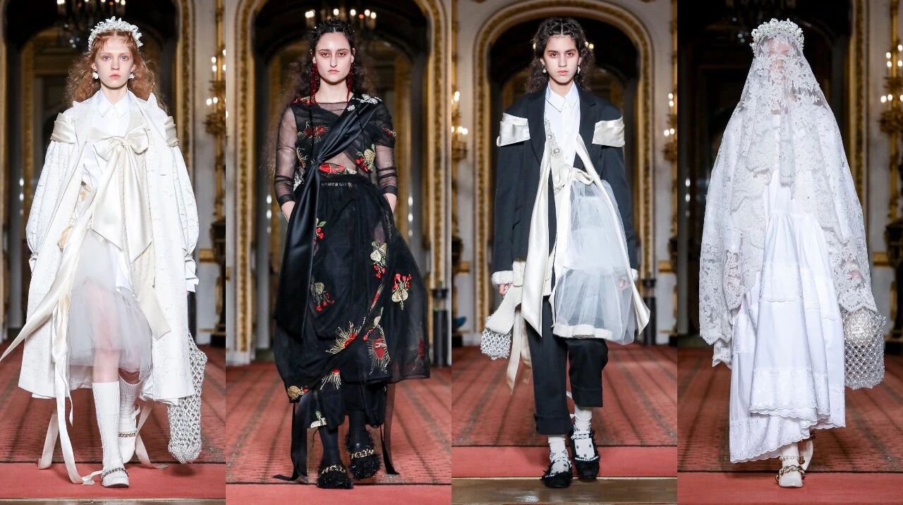 一个极具女性主义的海边传说,成为本季Simone Rocha的灵感来源,水滴形珍珠和渔网讲述着海边故事,还有无比蓬松的裙装和面纱,让人想起古典主义和信仰故事典籍,一直以来强壮的黑色朋克风格,在本季有了花卉刺绣与其相中和,融合成属于Rocha的独特美学。