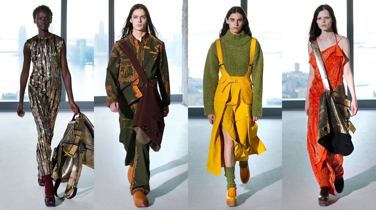 在曼哈顿的摩天大楼上,Sies Marjan带来了充满乡村记忆的系列,设计师不只使用草编、提篮之类的简单田园符号,而是将农业的专业内容剖析,并加以展示。农业工作服,自然的染色方式,和乡村建筑纹理都转化为时装的细节,打造不一样的乡村哲学。