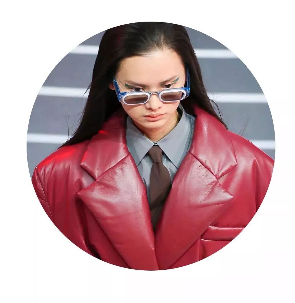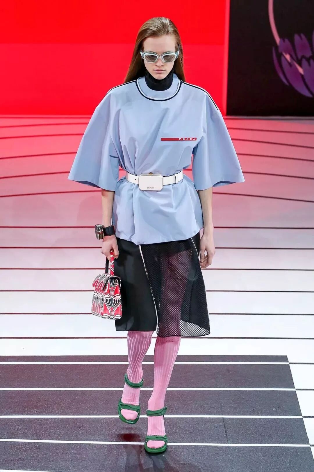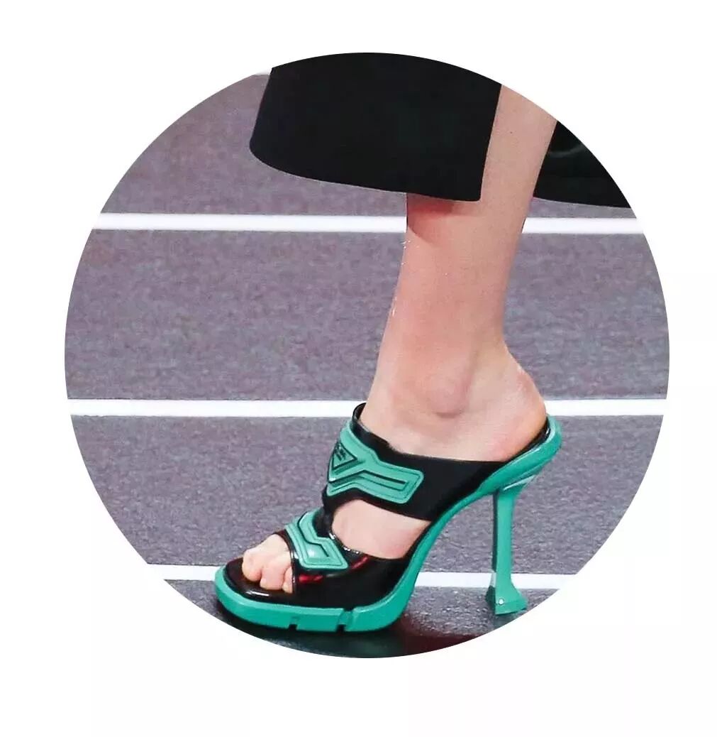 鞋履上,这一季的Prada向我们展现了颇具未来感的结合。传统的高跟与机能风的线条融合,搭配蓝绿色,让人眼前一亮。眼镜则与之呼应。