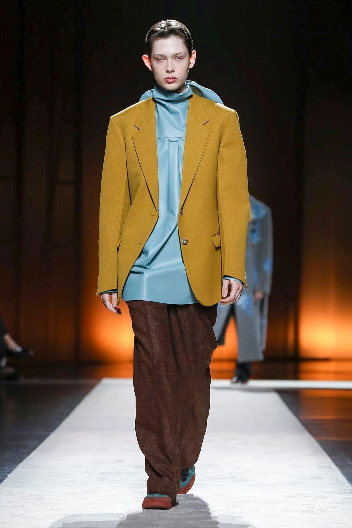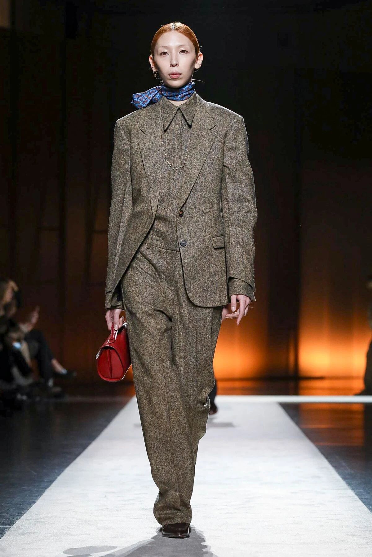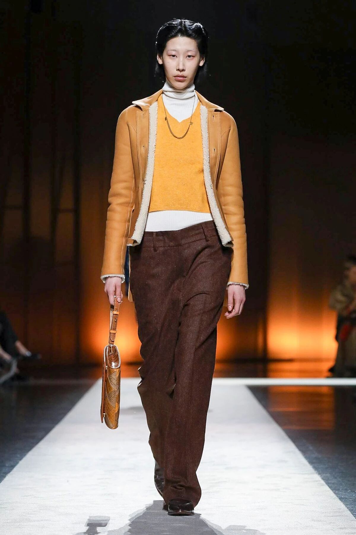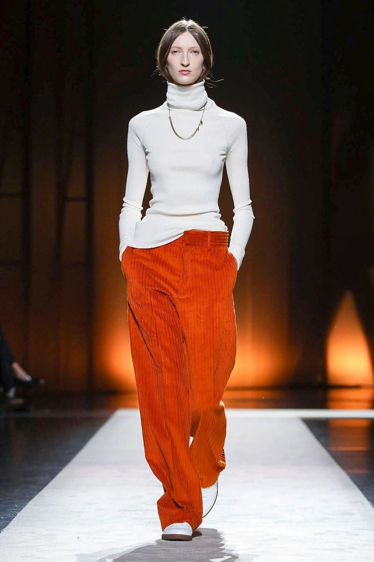 大秀开始就足以让人感受到都市女性的Power,高饱和的橙色灯芯绒长裤配合着贴身廓形的柔软针织,在展现出了女性的美好身姿的同时,又将摩登干练的都市女性特质全面挖掘了出来,给人一种独特又吸睛的视角,行动间清爽自如,透出这股迈向前的坚定韧劲。