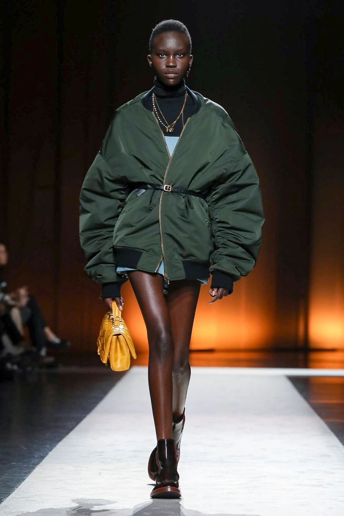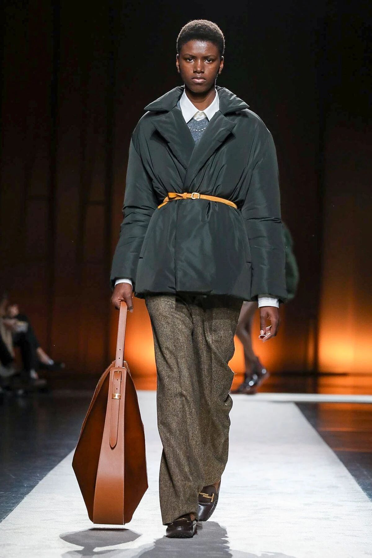 落肩棉服柔化了手臂线条,突破了臃肿棉服和高级成衣之间的壁垒,把温暖元素加入时装中,配以腰带进行装点,既实用又美观。