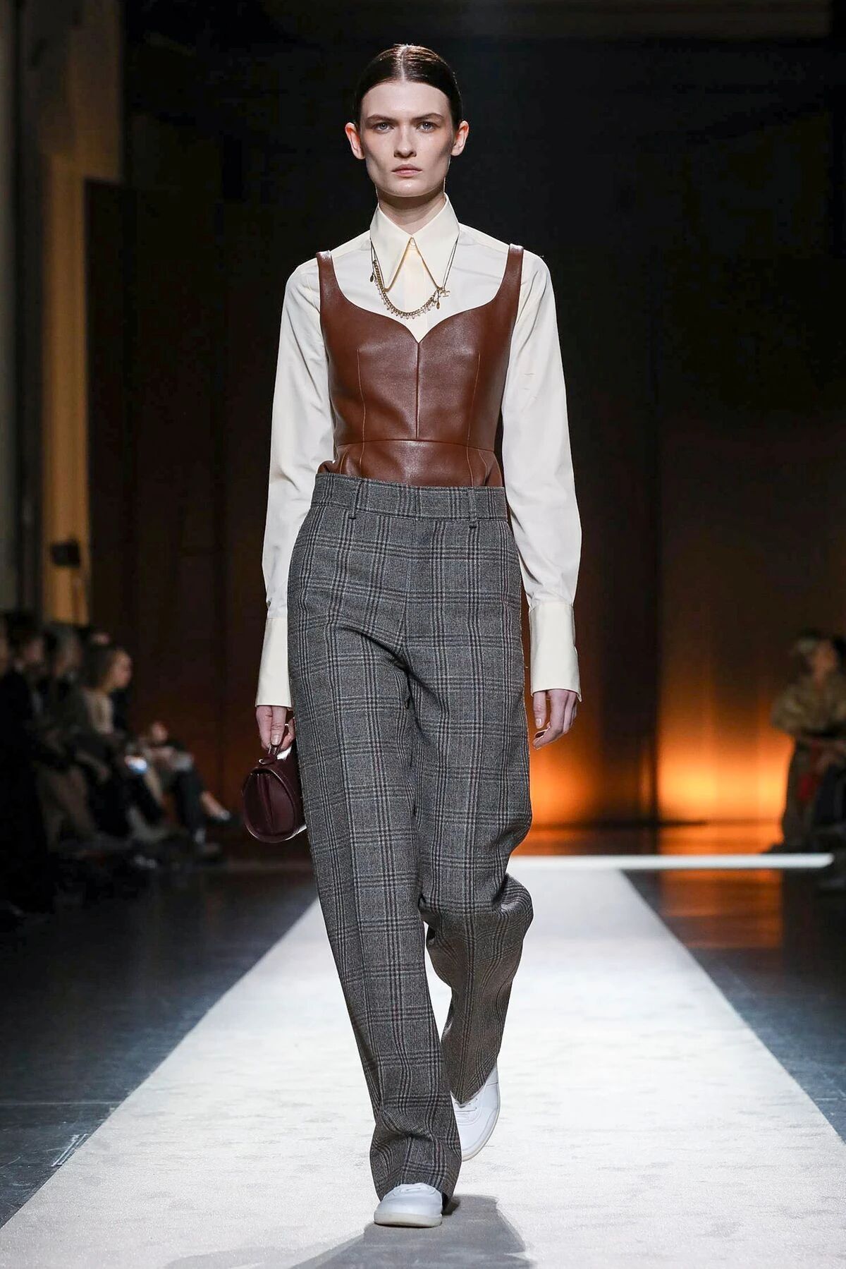 透过轮廓鲜明皮裙和胸衣背心,展现意大利女孩的形态美和曲线美,用干净利落的白色衬衫作为内衬和打底,塑造出高贵典雅的女性形象,同时还带有一丝庄严和禁欲。