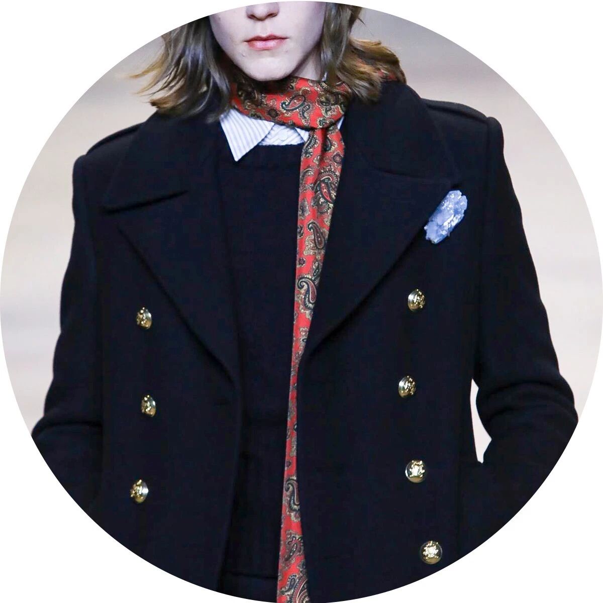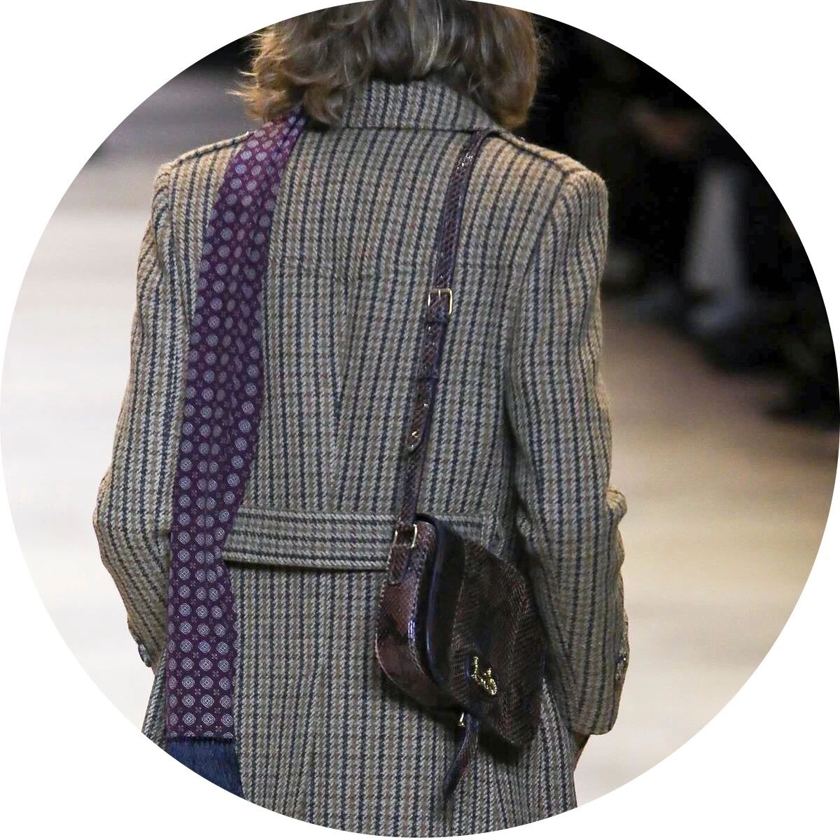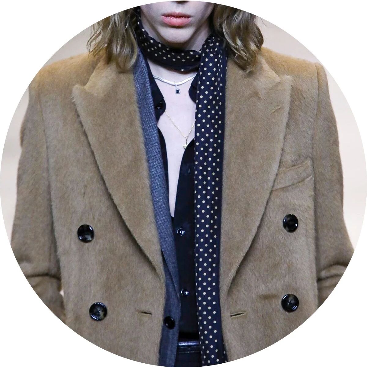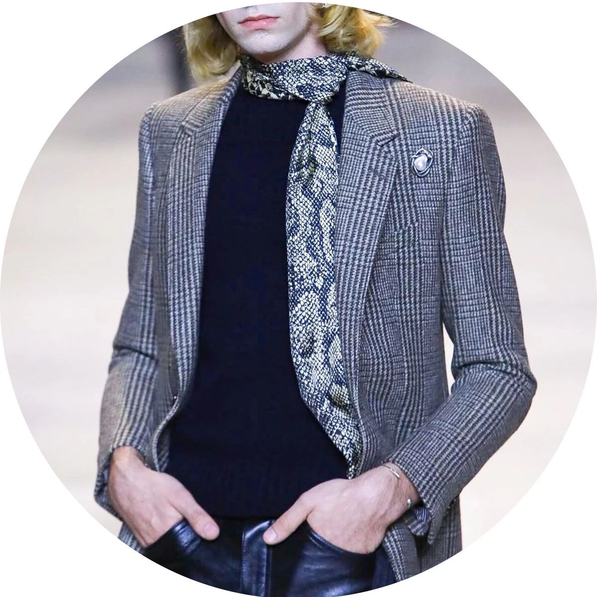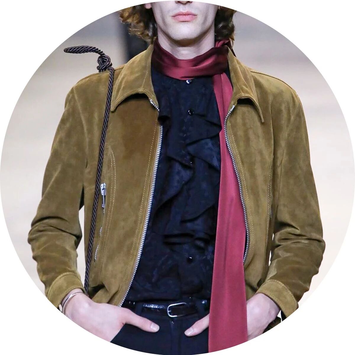 而男装上最多见的配饰则是偏窄的细款长丝巾,简单的绕一圈,剩余的部分则自由下垂在胸前或身后,无论是搭配连帽大衣、枪驳领大衣,抑或是双排扣西装,都极尽复古,经典的纯黑色、奢华优雅的香槟色、温软诱惑的酒红色......多色的长丝巾缀上波点和佩斯利纹样等等,又带来一点不羁的嬉皮士风格和浓郁的摇滚气息。