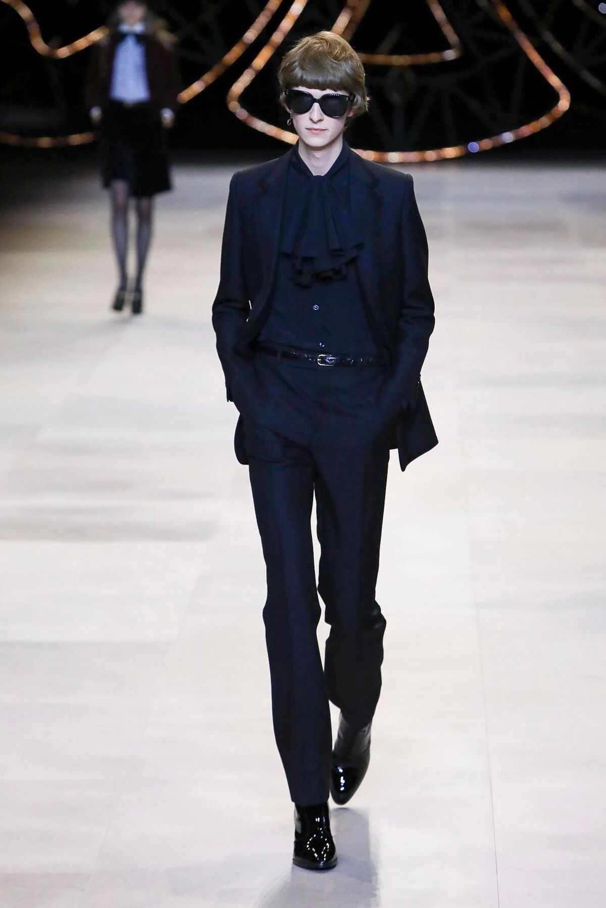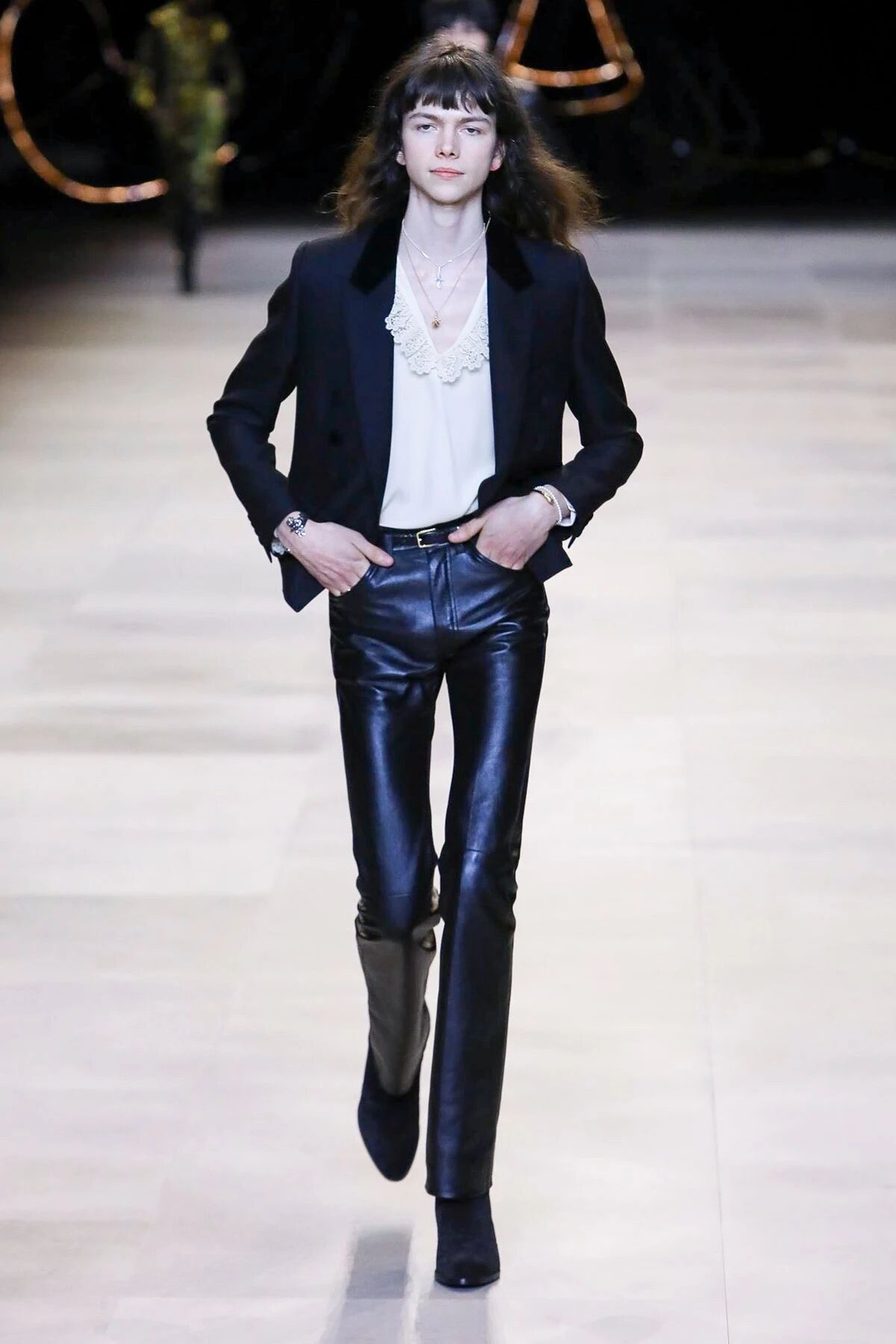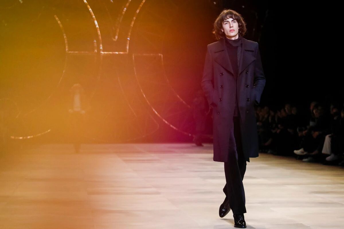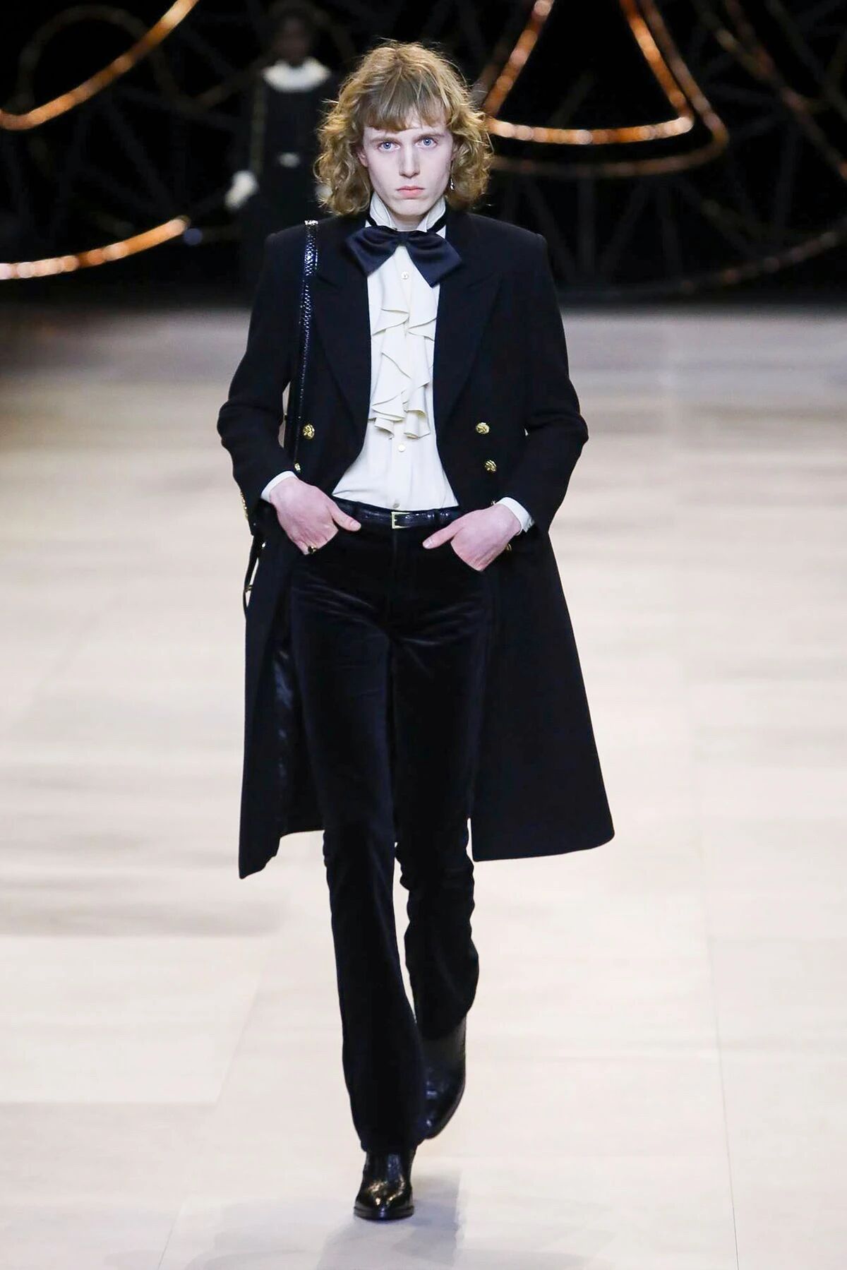 那些黑色灯芯绒喇叭裤相比之前“放松”的几季,剪裁变得更加苛刻,但与此同时便可修饰出所穿着者的超长比例,当然男士高跟靴与短夹克则可以将这种傲人的轮廓勾勒到极致。