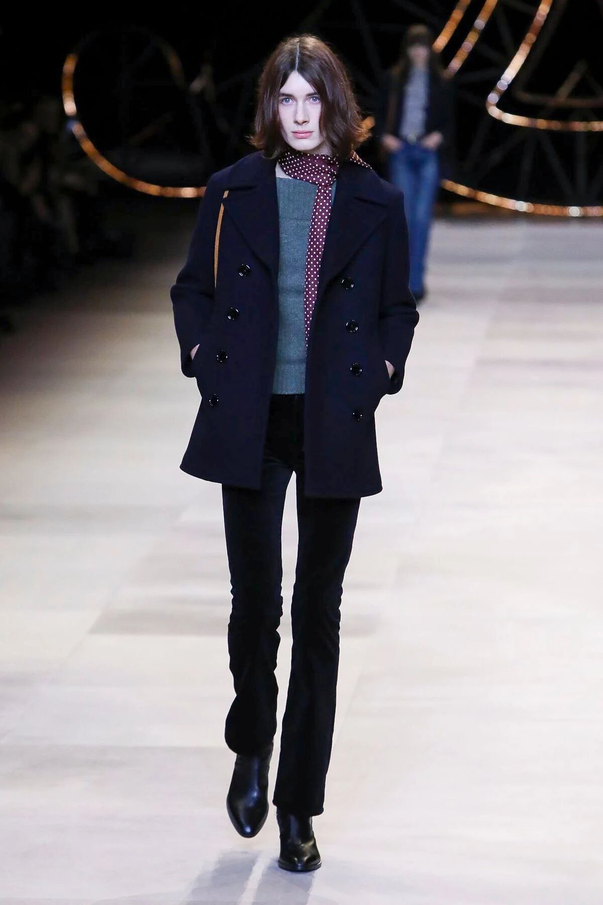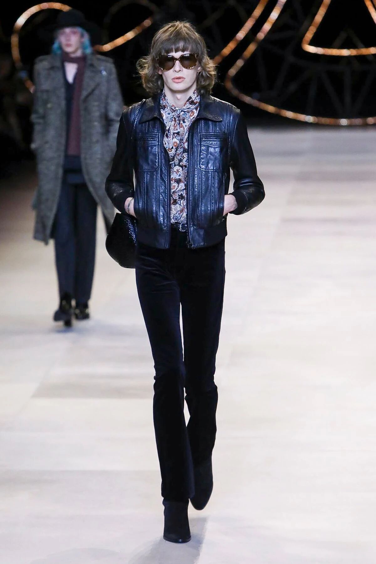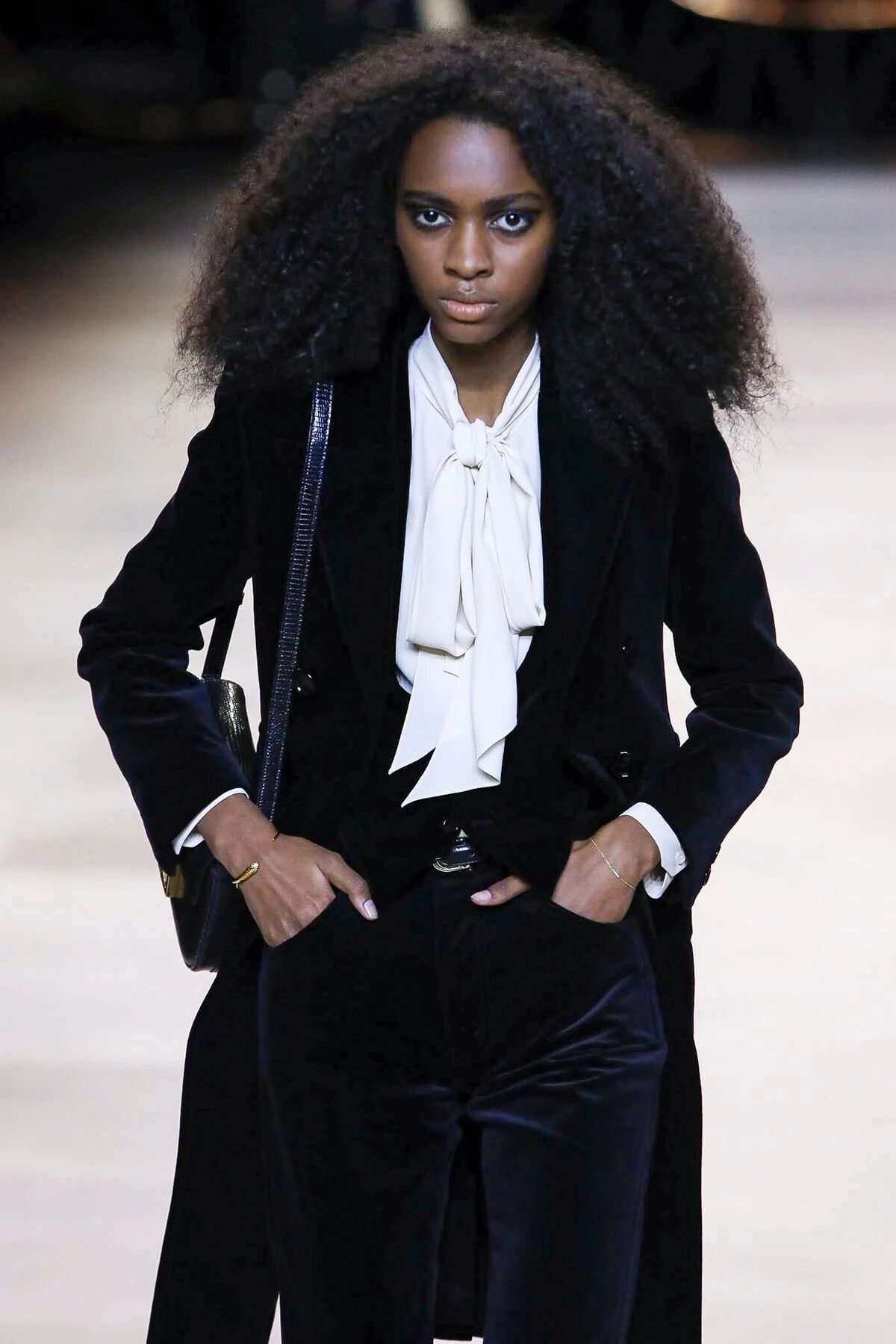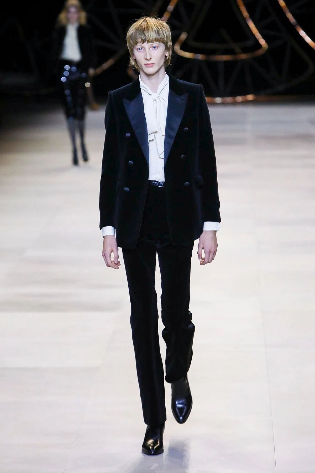 那些黑色灯芯绒喇叭裤相比之前“放松”的几季,剪裁变得更加苛刻,但与此同时便可修饰出所穿着者的超长比例,当然男士高跟靴与短夹克则可以将这种傲人的轮廓勾勒到极致。