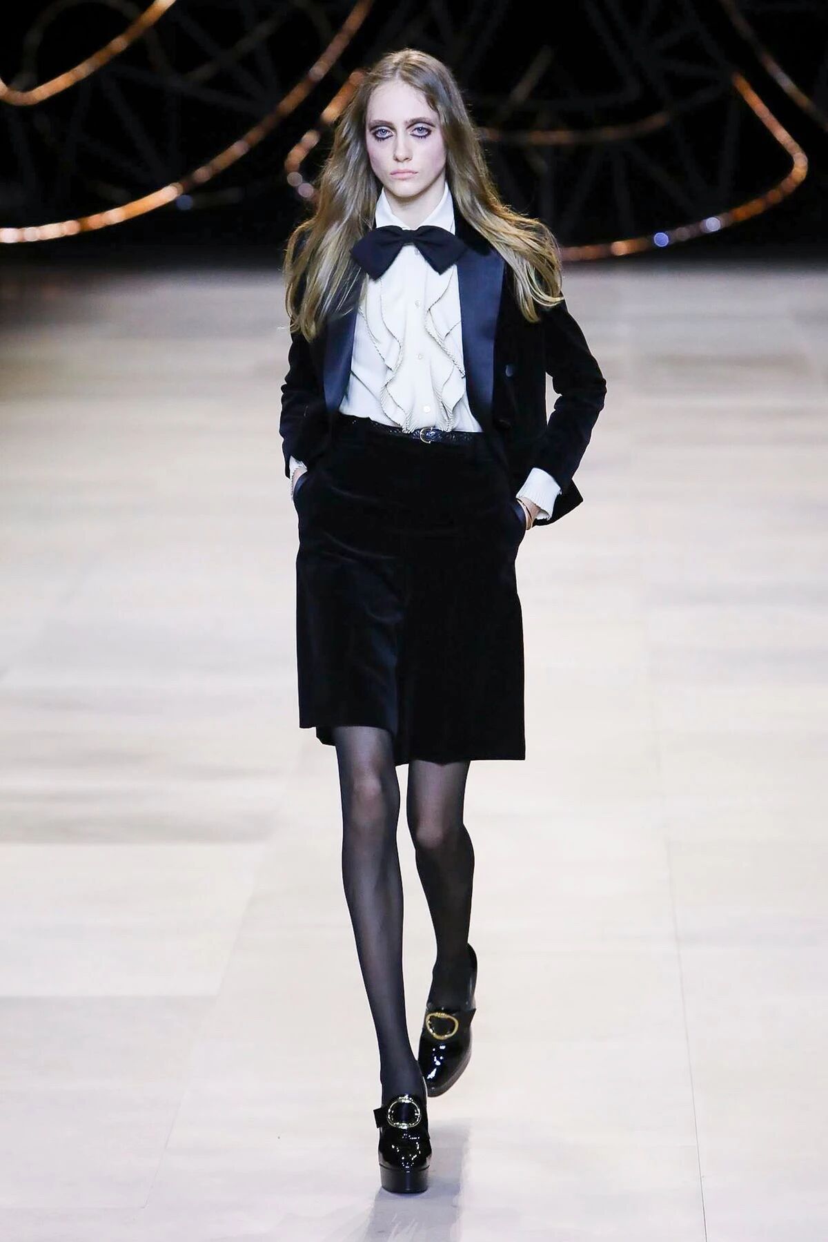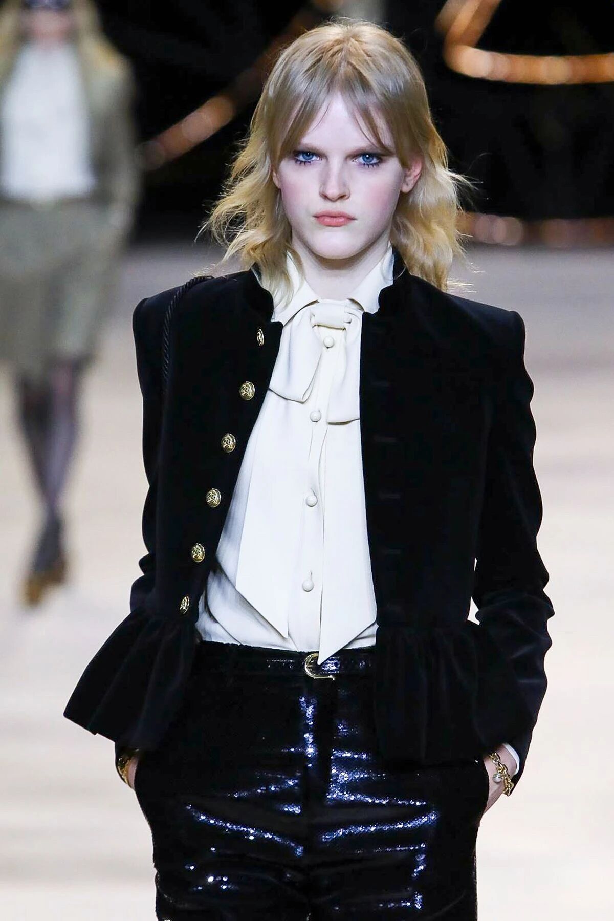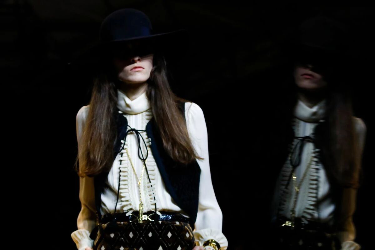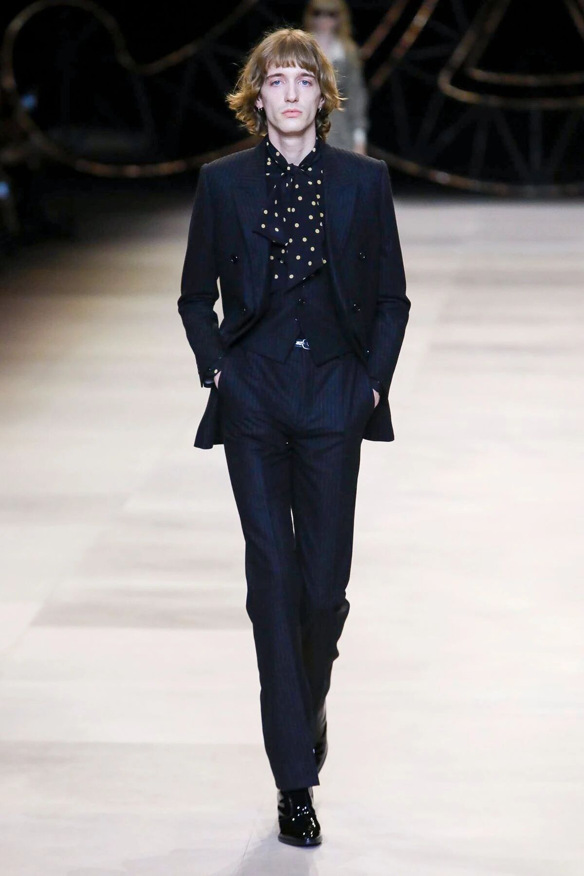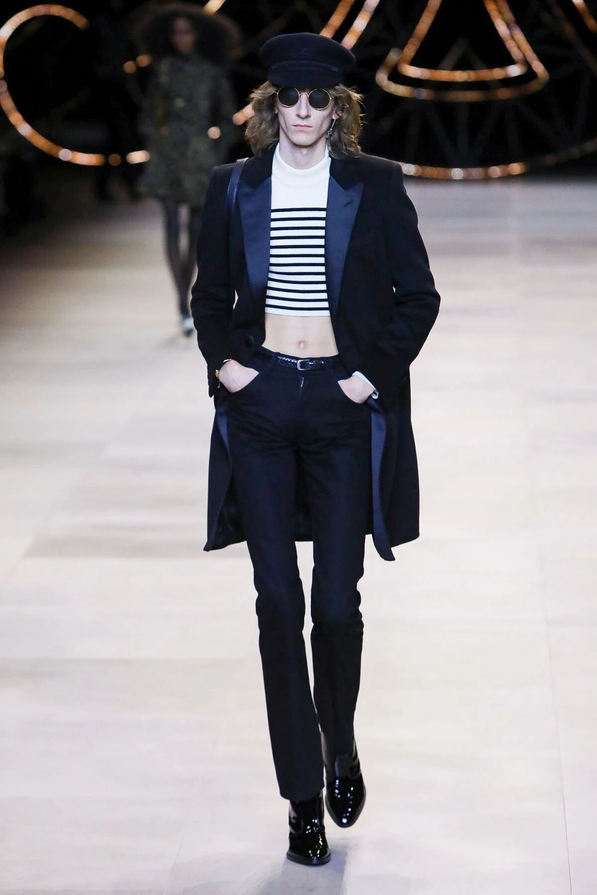 那些黑色灯芯绒喇叭裤相比之前“放松”的几季,剪裁变得更加苛刻,但与此同时便可修饰出所穿着者的超长比例,当然男士高跟靴与短夹克则可以将这种傲人的轮廓勾勒到极致。
