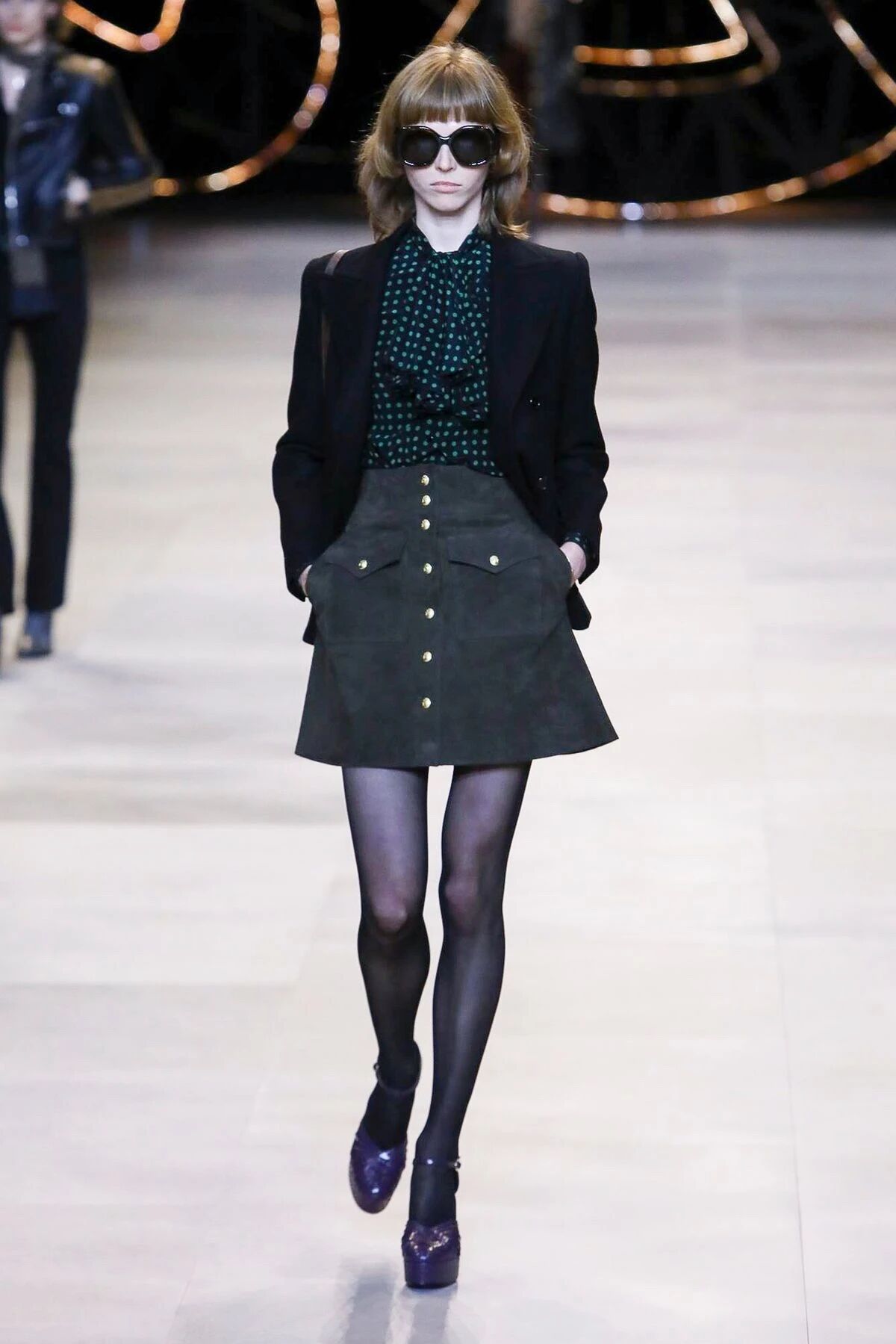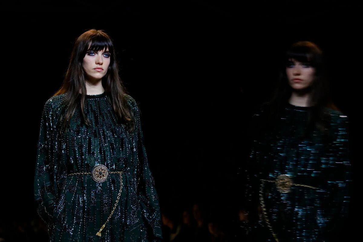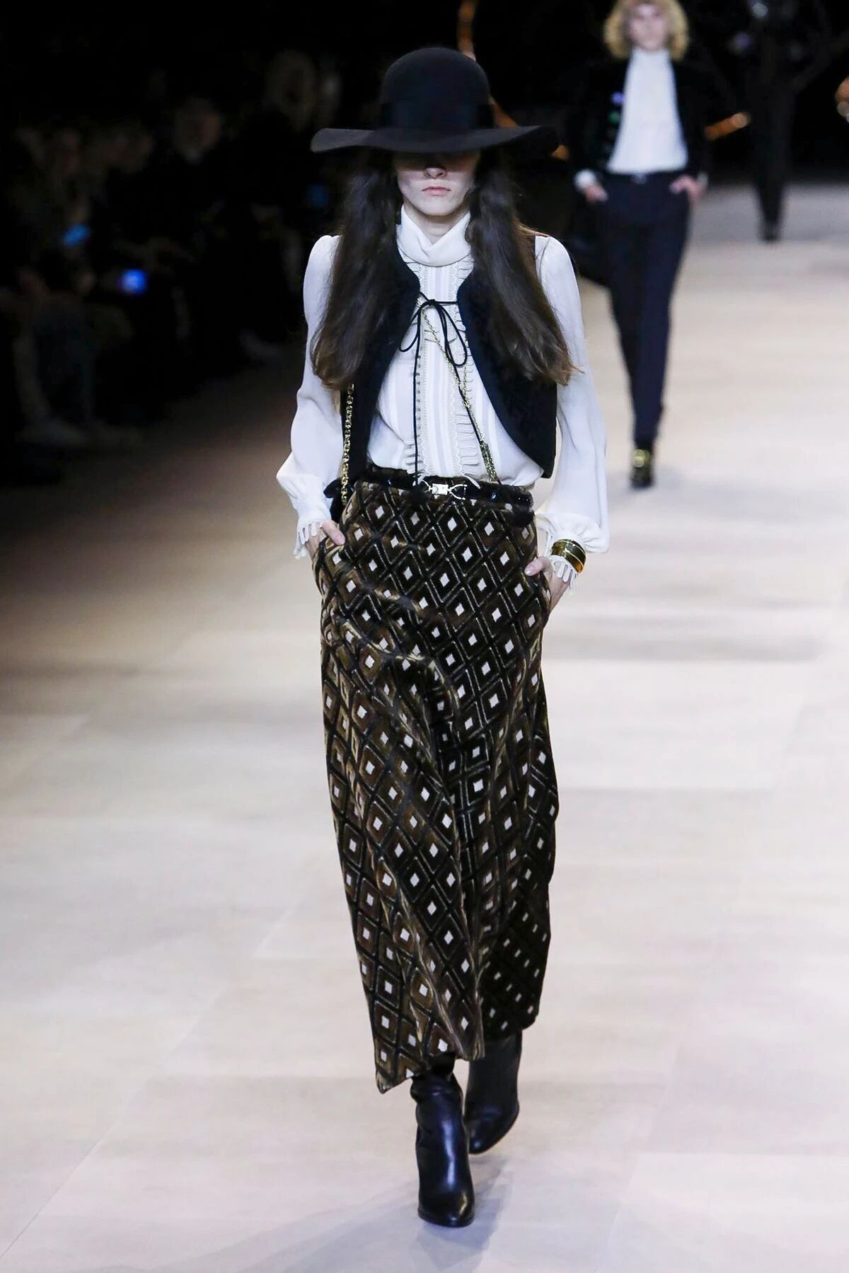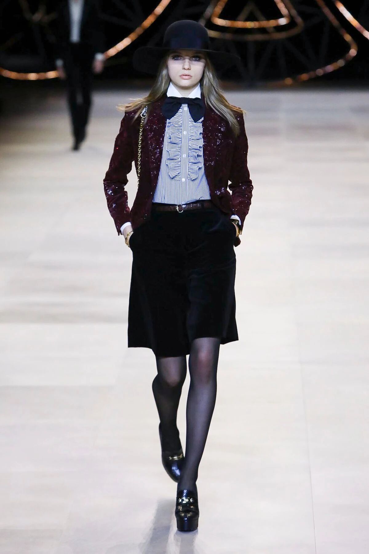 那些黑色灯芯绒喇叭裤相比之前“放松”的几季,剪裁变得更加苛刻,但与此同时便可修饰出所穿着者的超长比例,当然男士高跟靴与短夹克则可以将这种傲人的轮廓勾勒到极致。
