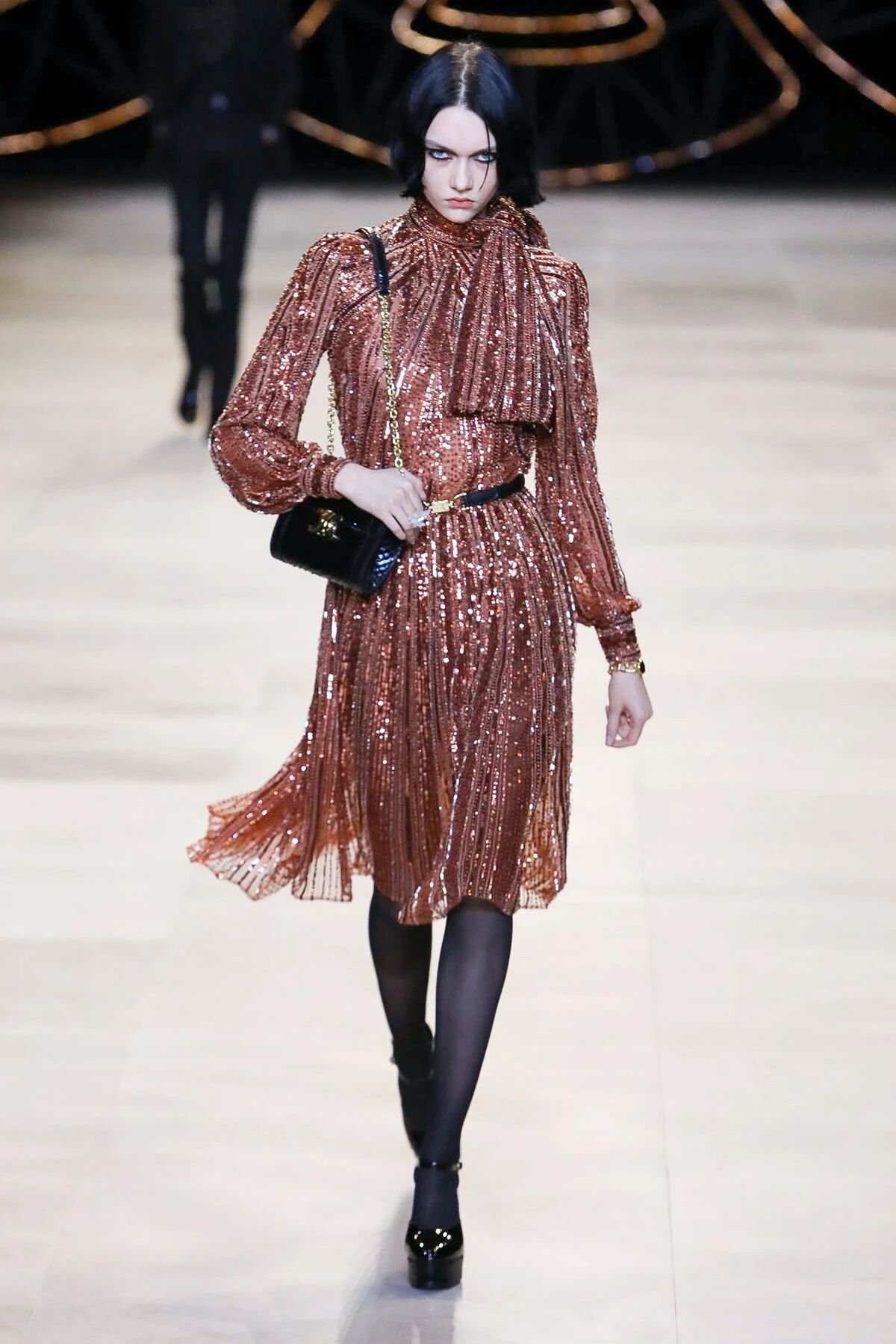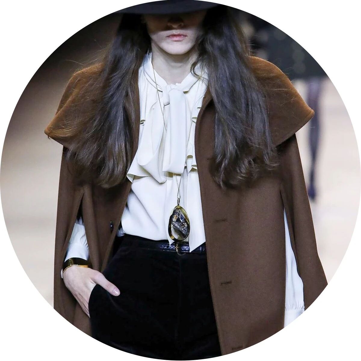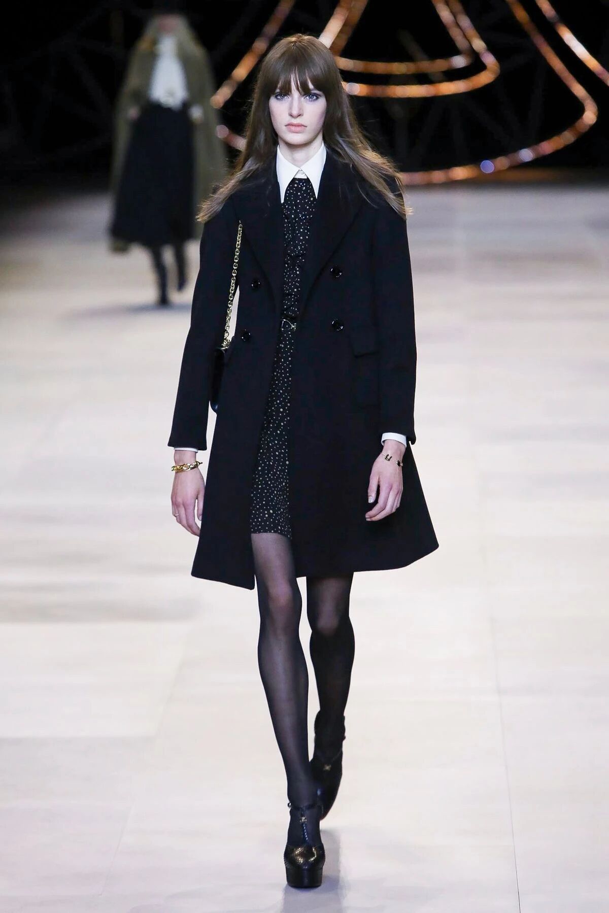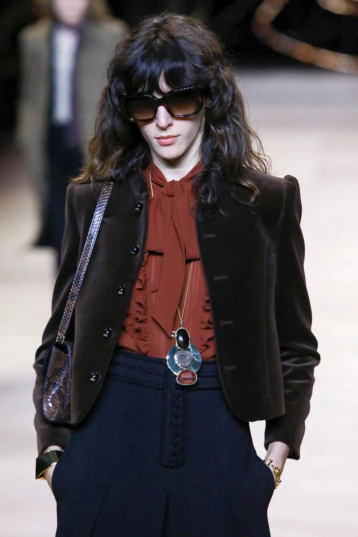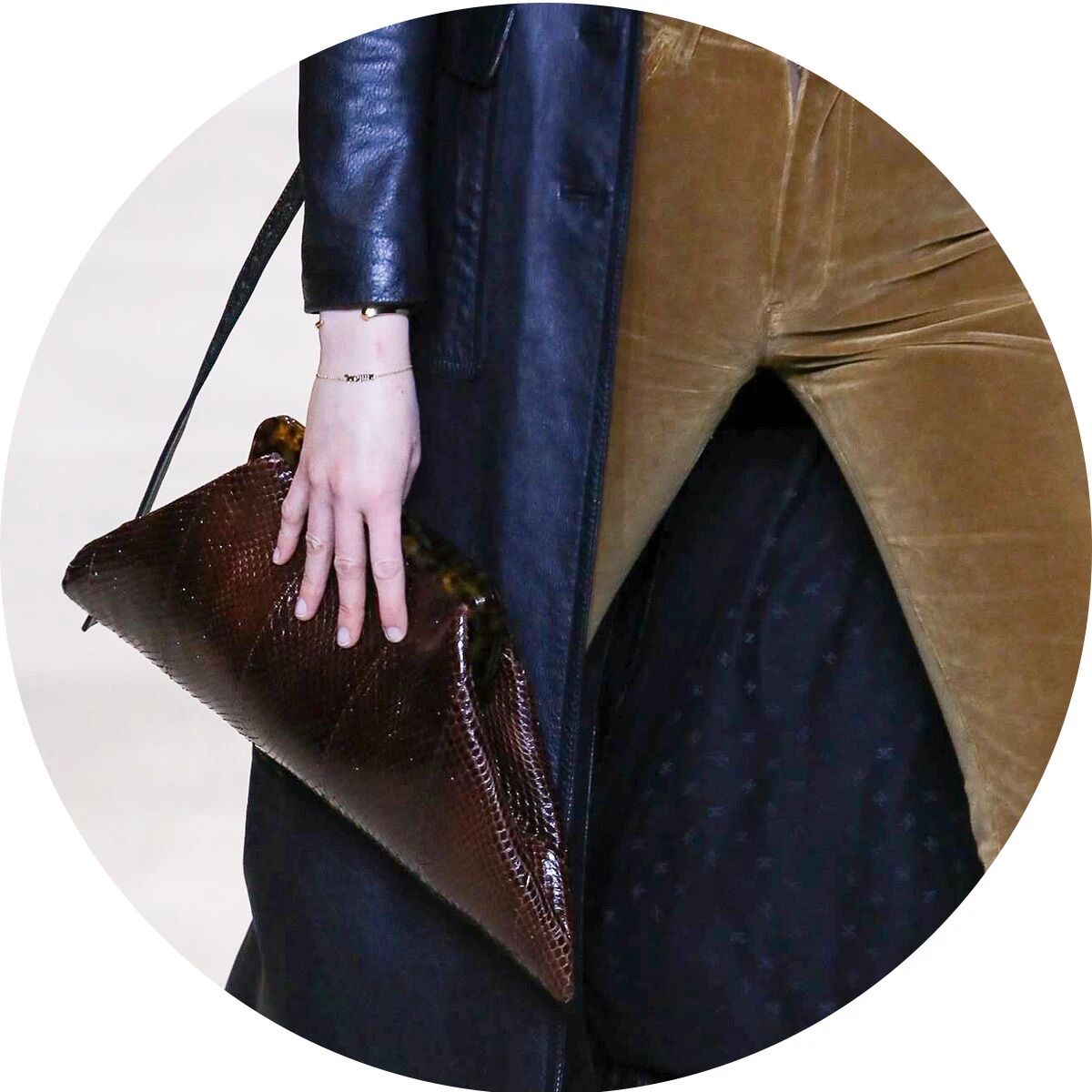 闪着璀璨金光的配饰们就像巴黎夜晚迷人的灯光,永远是Hedi Slimane设计的主旋律。巴黎男孩和女孩们的夜生活就要开始了,他们穿着晚装纷沓而至。女孩们戴上了醒目的长吊坠来点缀她们脖颈间的空白,那些项链造型各异,低饱和度的配色与服装本身达成了巧妙的融合,复古又不失华丽。LES CRISTAUX CELINE,这条新的CELINE珠宝生产线围绕每个石材的独特特性而打造。水晶,虎眼,紫水晶,烟熏石......HEDI SLIMANE会为它们的符号含义,其历史和文化意义以及其美感认真地选择每个石头。镶嵌在金属框架中,每只CRISTAUX CELINE珠宝都是独特的。