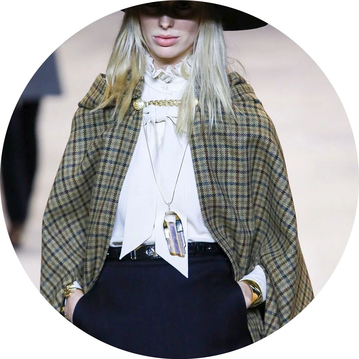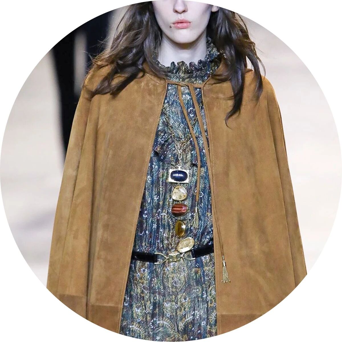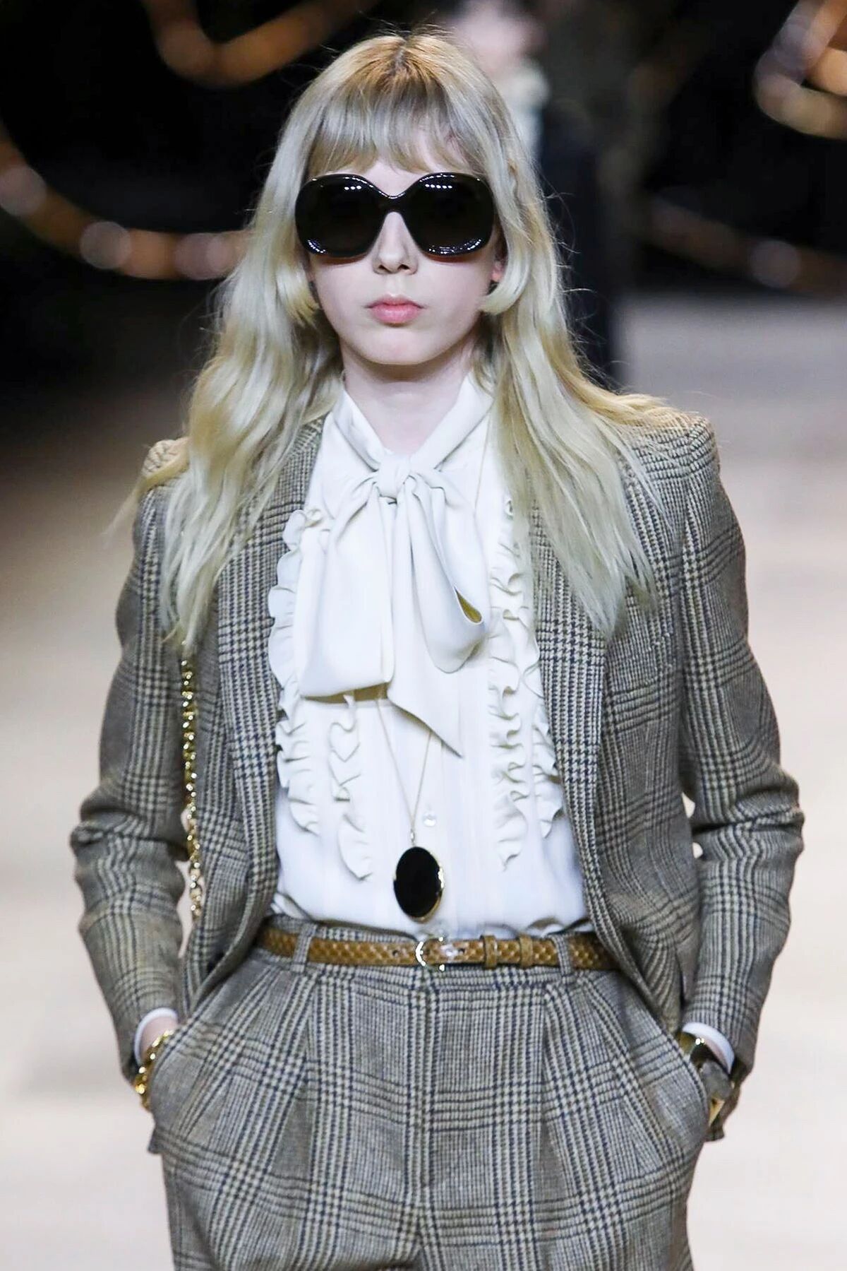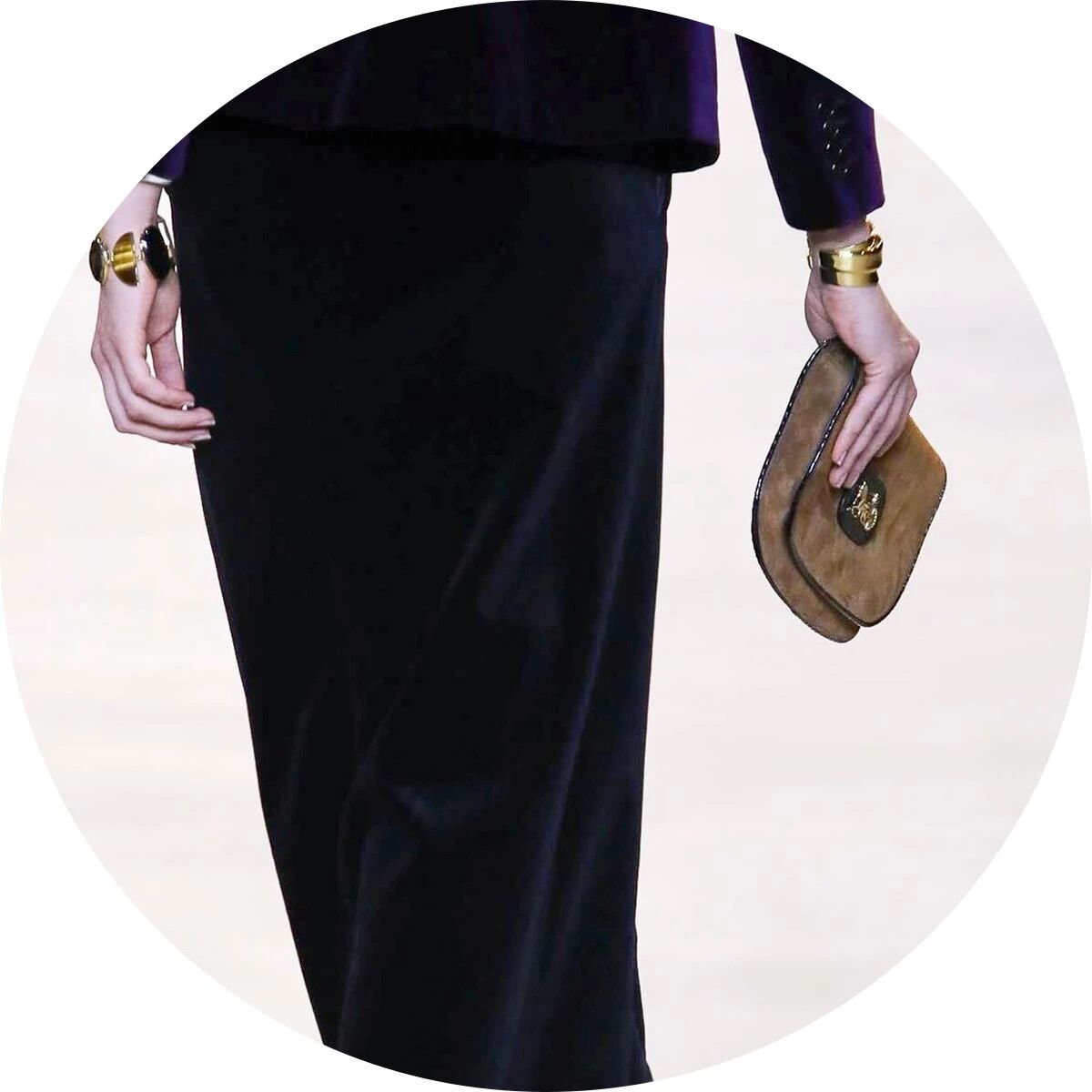 闪着璀璨金光的配饰们就像巴黎夜晚迷人的灯光,永远是Hedi Slimane设计的主旋律。巴黎男孩和女孩们的夜生活就要开始了,他们穿着晚装纷沓而至。女孩们戴上了醒目的长吊坠来点缀她们脖颈间的空白,那些项链造型各异,低饱和度的配色与服装本身达成了巧妙的融合,复古又不失华丽。LES CRISTAUX CELINE,这条新的CELINE珠宝生产线围绕每个石材的独特特性而打造。水晶,虎眼,紫水晶,烟熏石......HEDI SLIMANE会为它们的符号含义,其历史和文化意义以及其美感认真地选择每个石头。镶嵌在金属框架中,每只CRISTAUX CELINE珠宝都是独特的。
