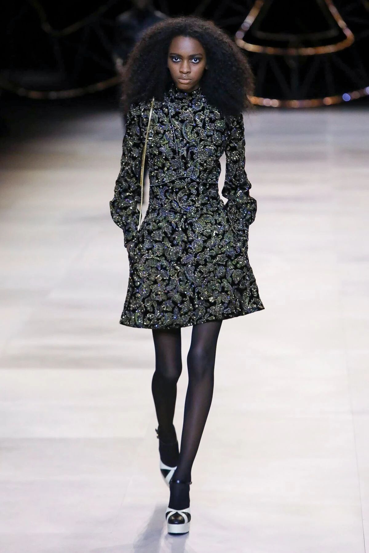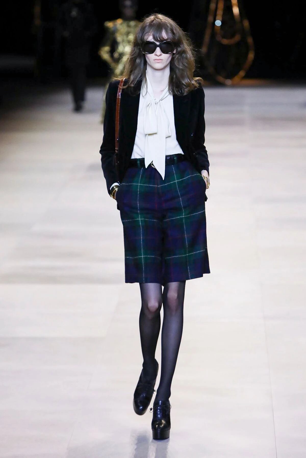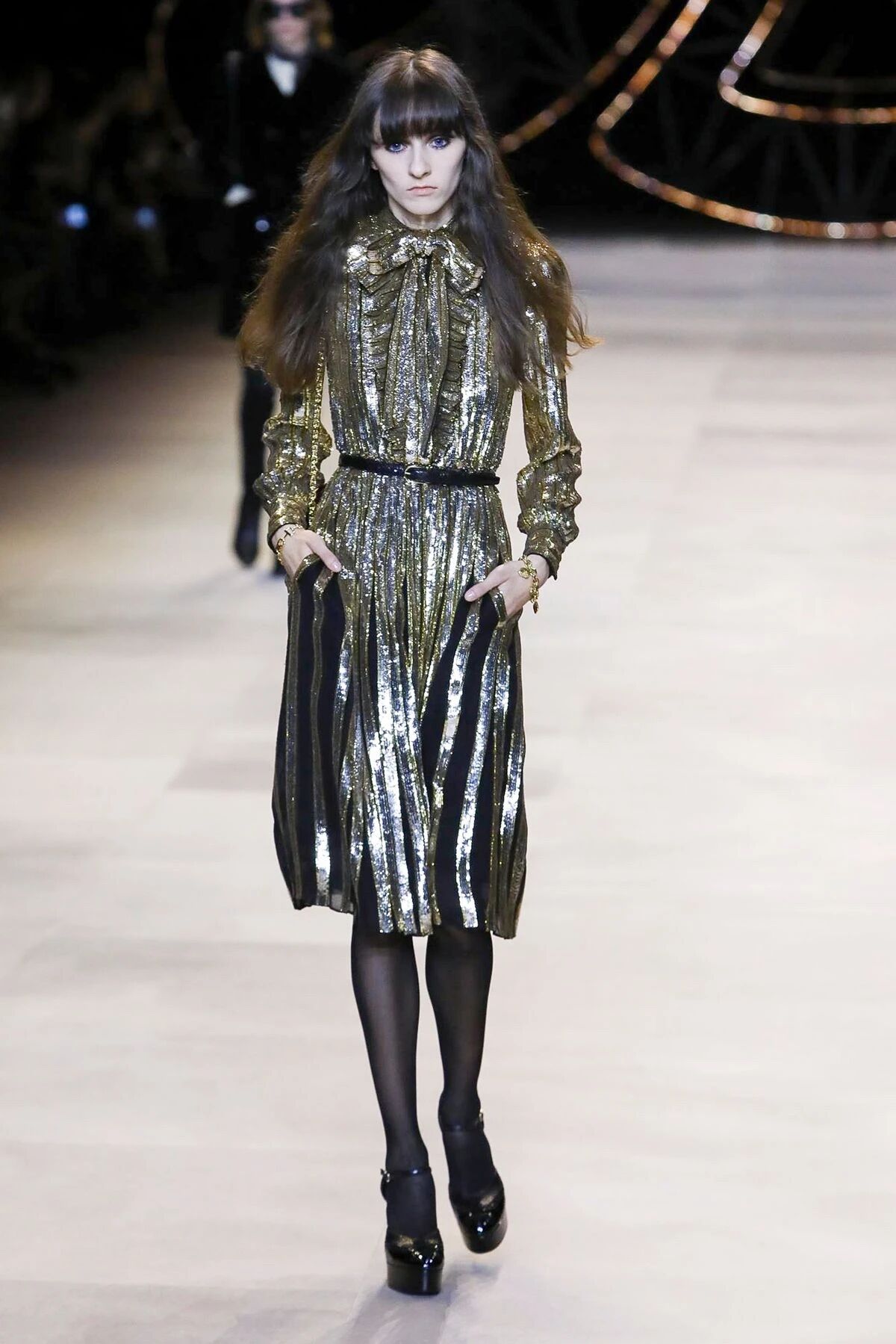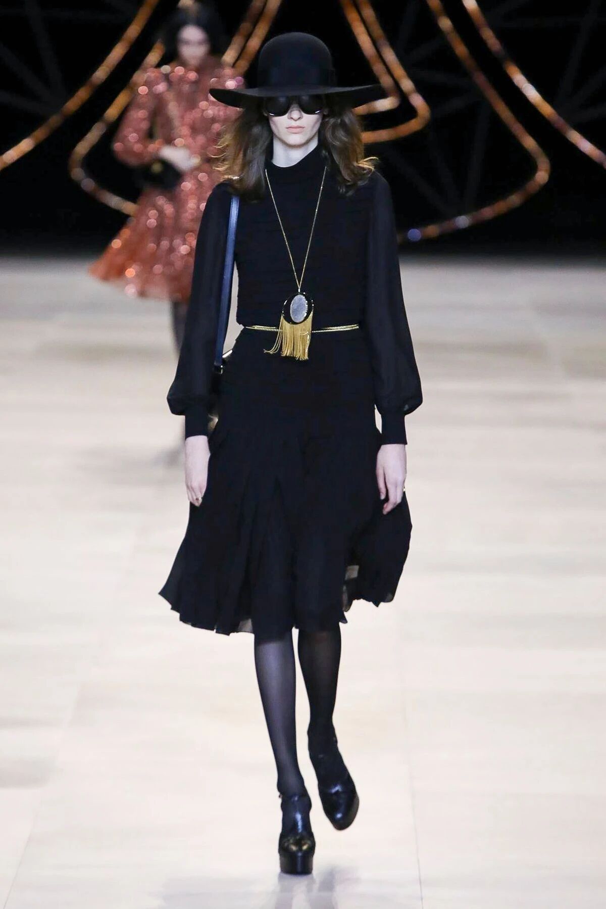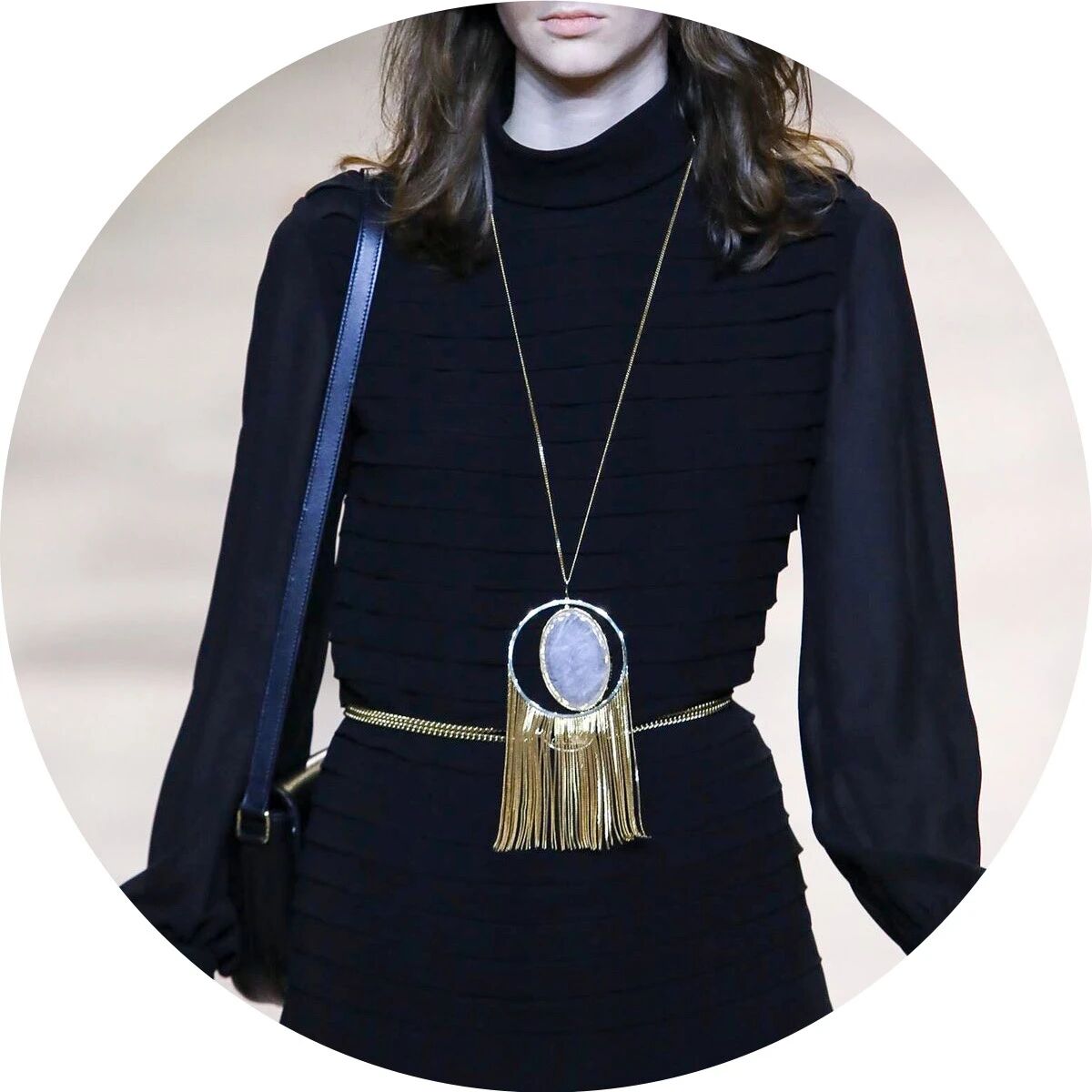 闪着璀璨金光的配饰们就像巴黎夜晚迷人的灯光,永远是Hedi Slimane设计的主旋律。巴黎男孩和女孩们的夜生活就要开始了,他们穿着晚装纷沓而至。女孩们戴上了醒目的长吊坠来点缀她们脖颈间的空白,那些项链造型各异,低饱和度的配色与服装本身达成了巧妙的融合,复古又不失华丽。LES CRISTAUX CELINE,这条新的CELINE珠宝生产线围绕每个石材的独特特性而打造。水晶,虎眼,紫水晶,烟熏石......HEDI SLIMANE会为它们的符号含义,其历史和文化意义以及其美感认真地选择每个石头。镶嵌在金属框架中,每只CRISTAUX CELINE珠宝都是独特的。