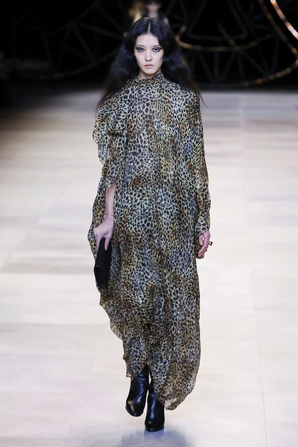男模纤瘦的烟管喇叭裤下最吸引人的就是一双双线条锋利干脆的短靴。蛇纹和牛皮的不同肌理与细腻的天鹅绒长裤和脆质的牛仔裤碰撞带来强烈的视觉冲击。金属质感的皮革和高坡跟,再加上长度恰到好处止于鞋面的喇叭裤口,让每一个模特的身影都像刀锋,Hedi Slimane用自己锋利且精确的剪裁切开了巴黎温柔的夜色。