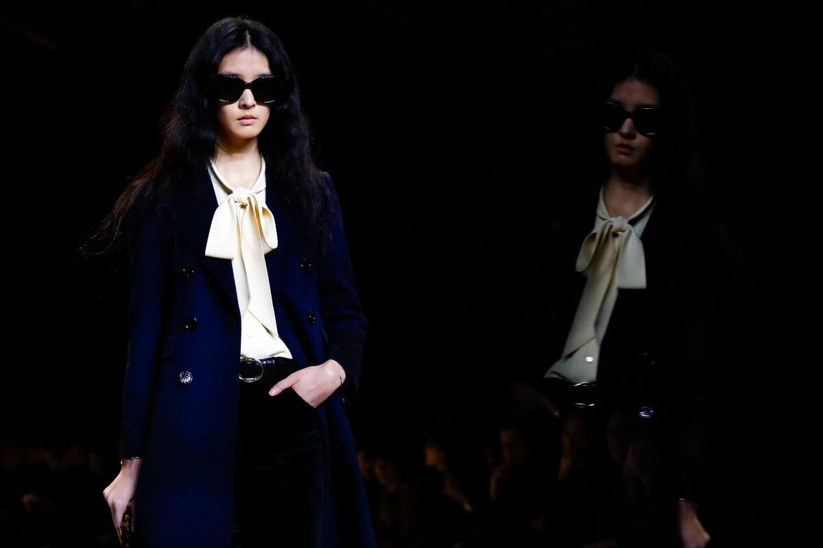 本季所出现的丝质衬衫不分男女,有着夸张的波德莱尔式的蝴蝶结与荷叶边,优雅至极,即使搭配剪裁板正的西装也会流露着一股浪漫的柔情,是这个系列最值得下单的单品。