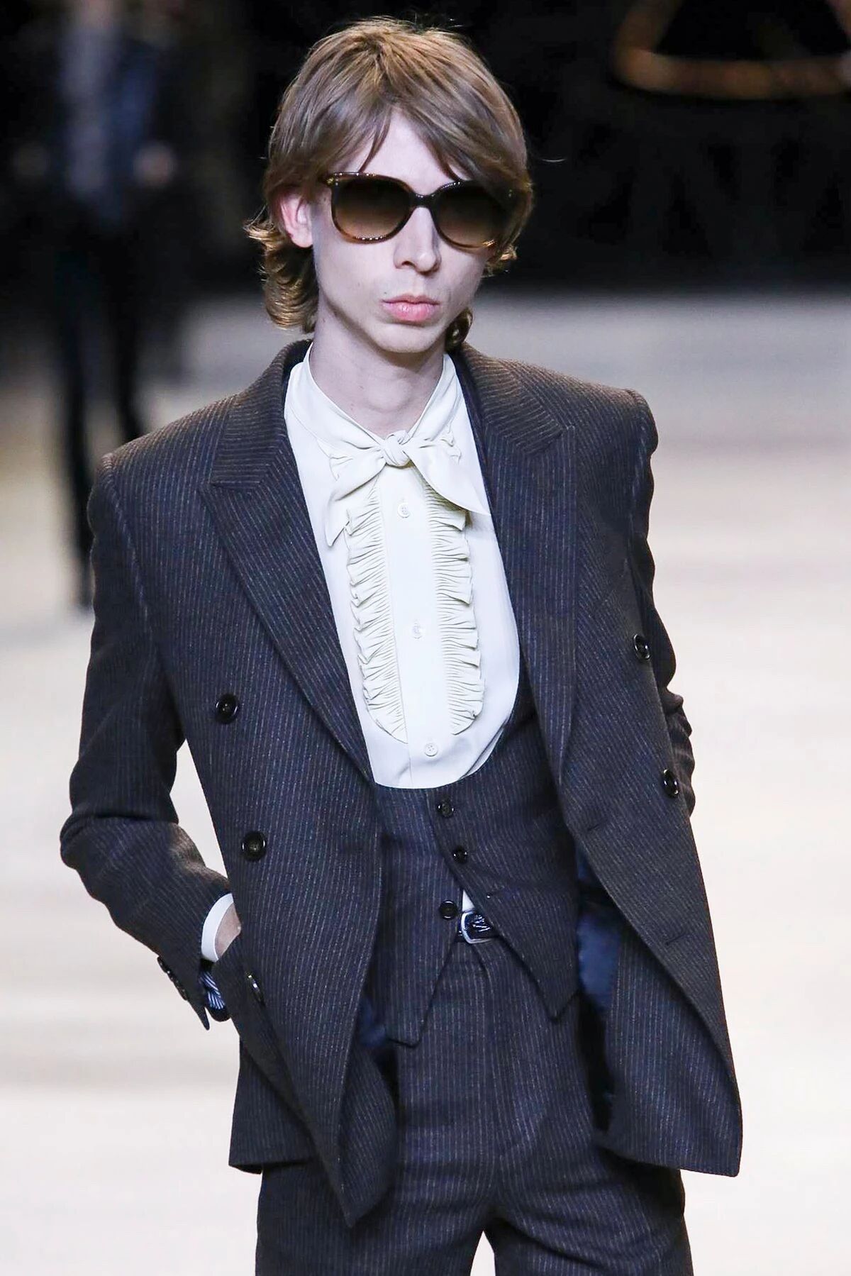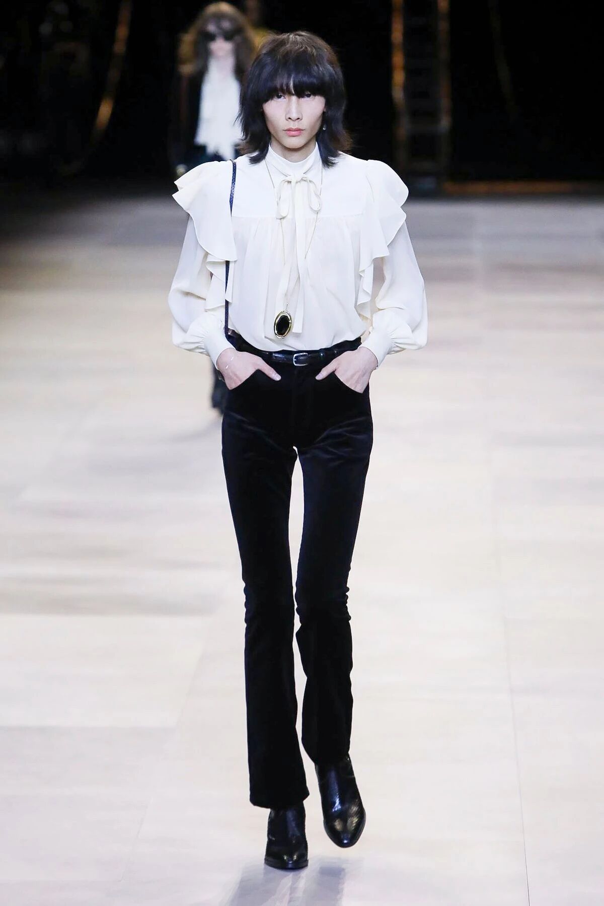 时下最流行的雌雄同体是Hedi Slimane已经延续至今的风格,从CELINE的首秀一开始,他的所有系列便不再强调男女。那些阴柔浪漫的荷叶边衬衫与硬朗的西装外套被男孩女孩所共享。