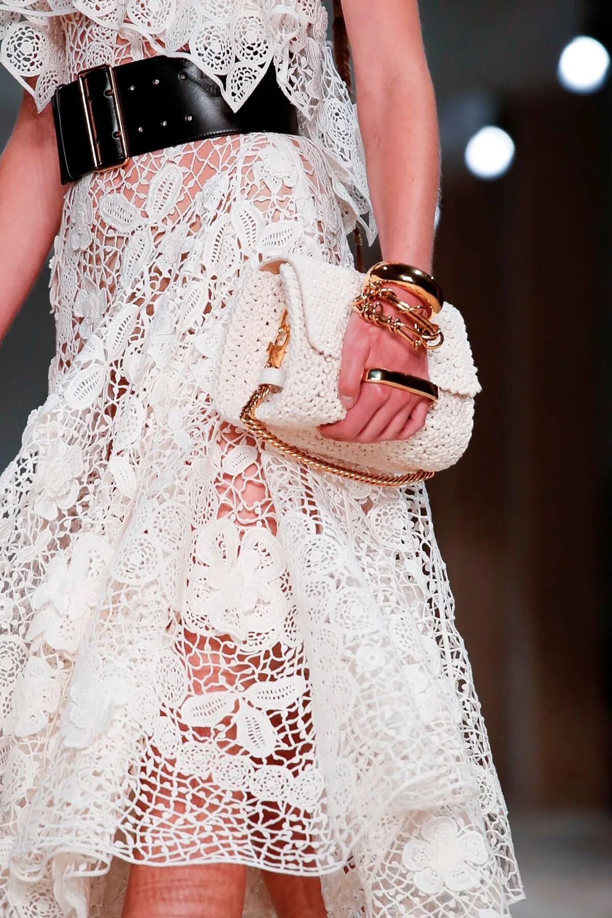 凭借着柔软的触感,编织包在今年的Alexander McQueen时装秀上也大放异彩,覆盖的3D钩编花,让人瞬间就能感受到浓郁的春日氛围。