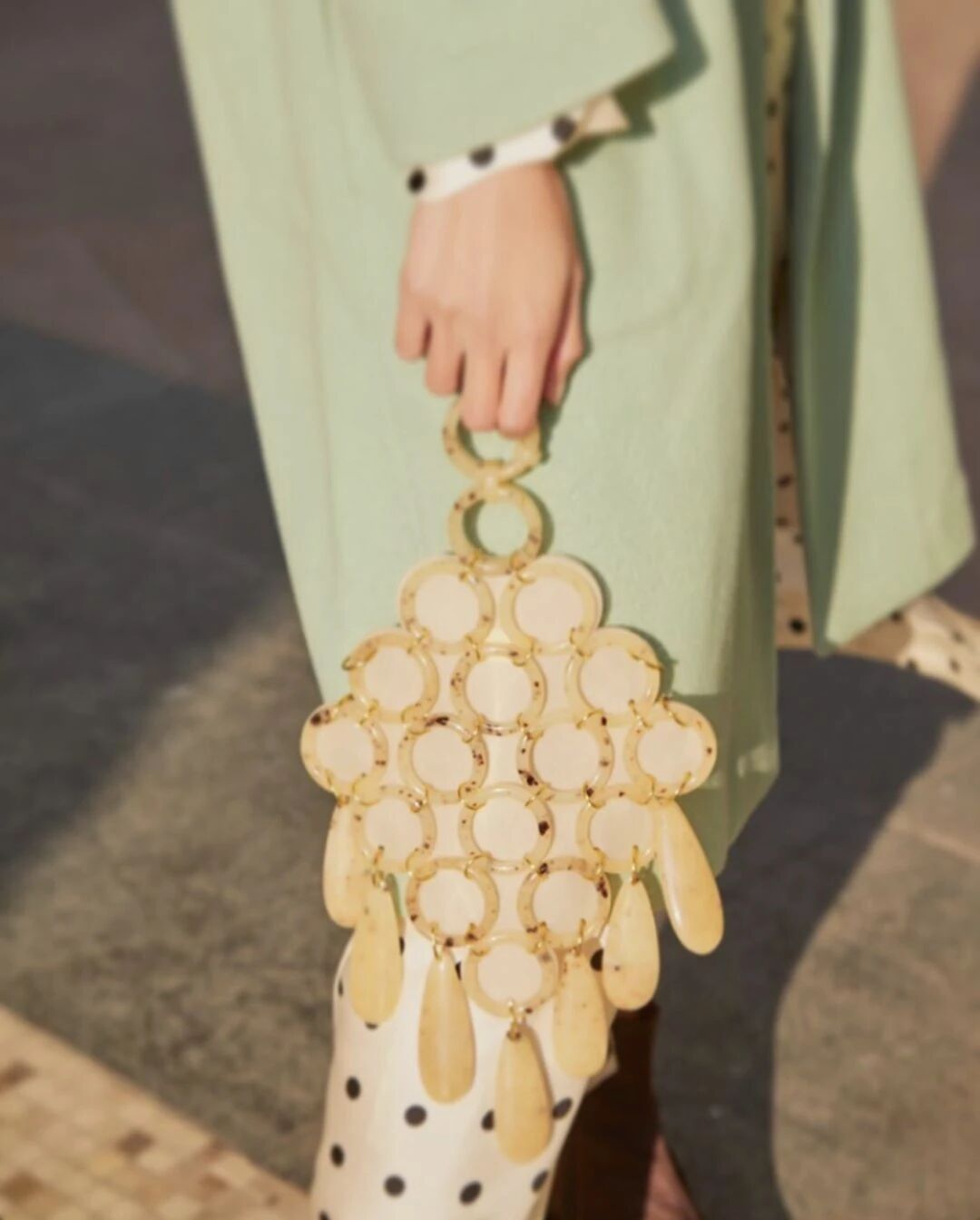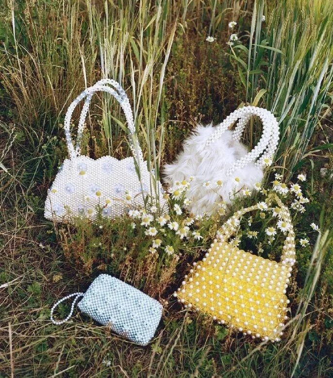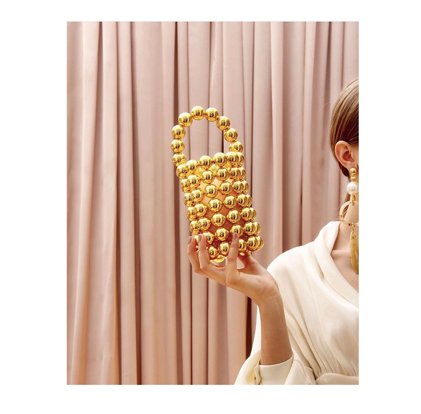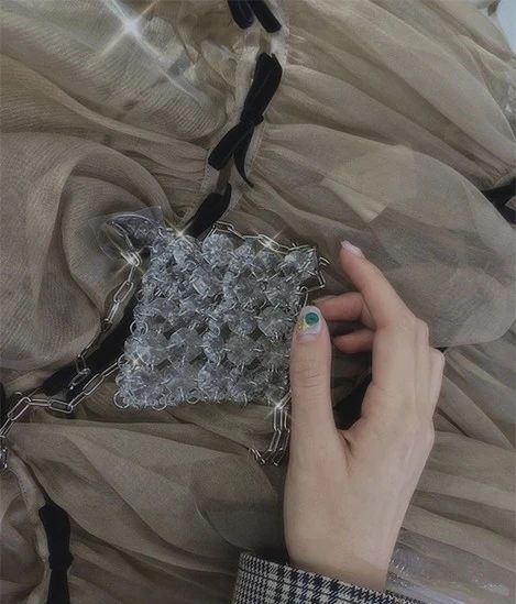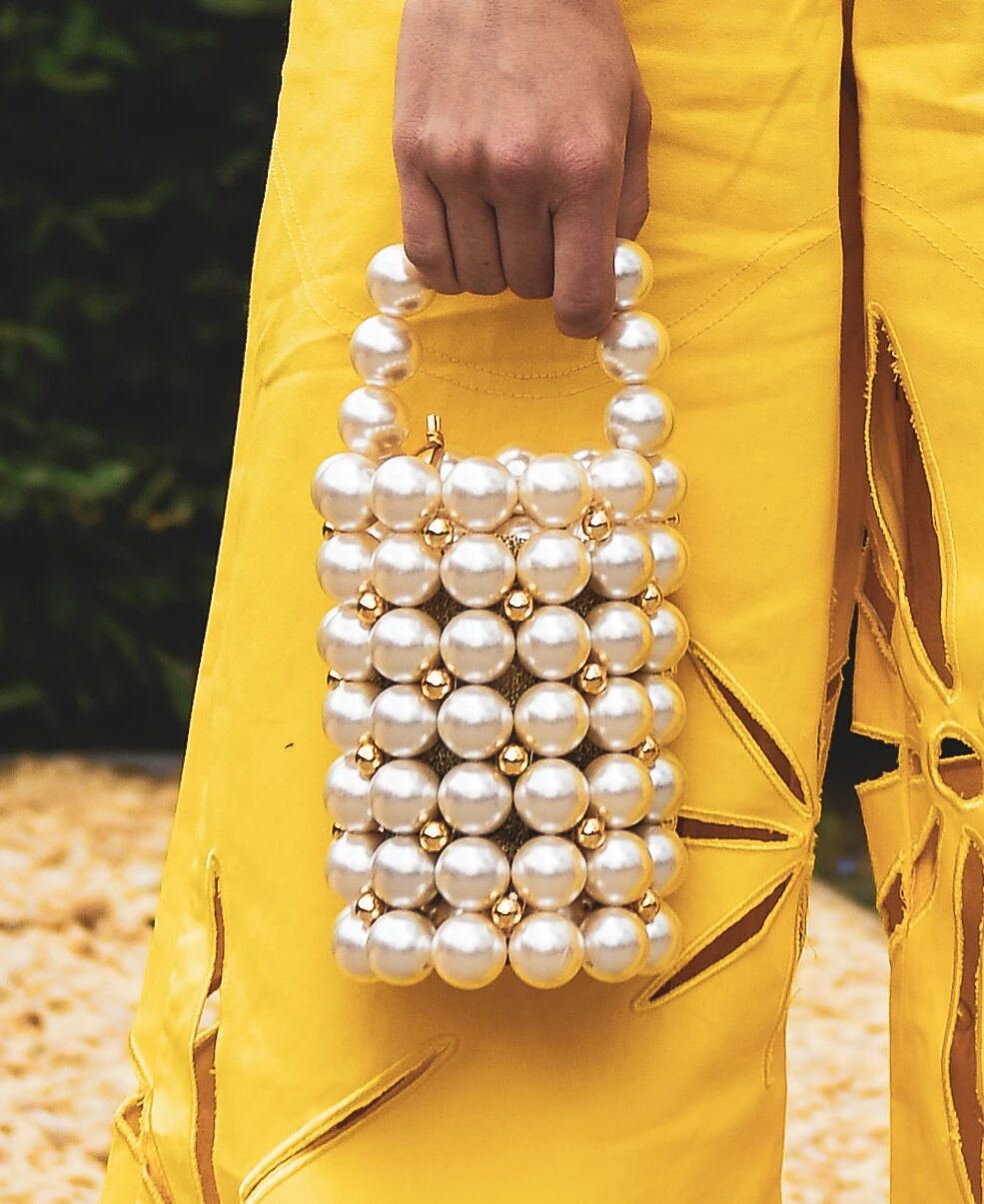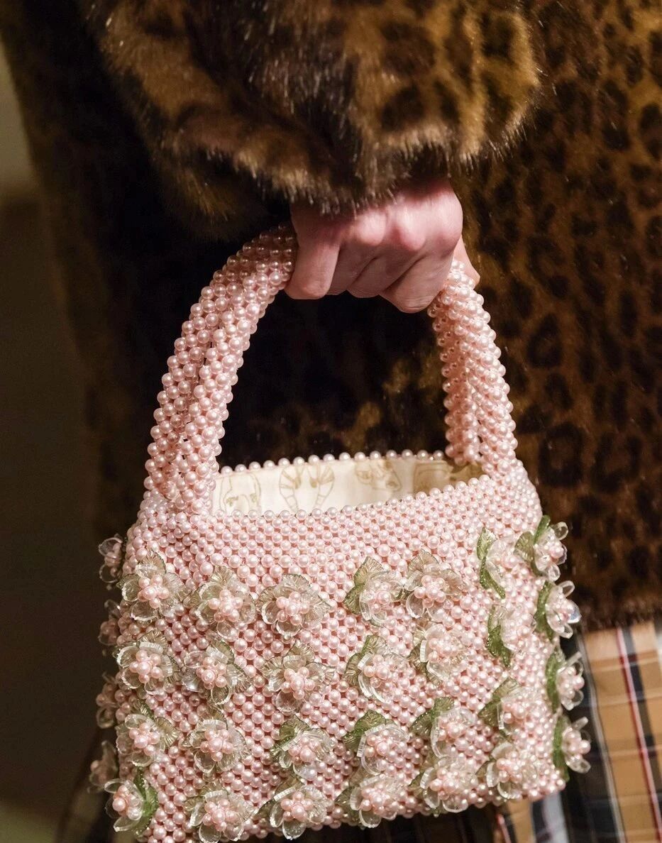 除了传统的皮质、线型编织,还有各种以亚克力和珍珠为原材料的编织成包包也很受欢迎,估计大家看到这款方方正正的珍珠包都会觉得有些眼熟吧。