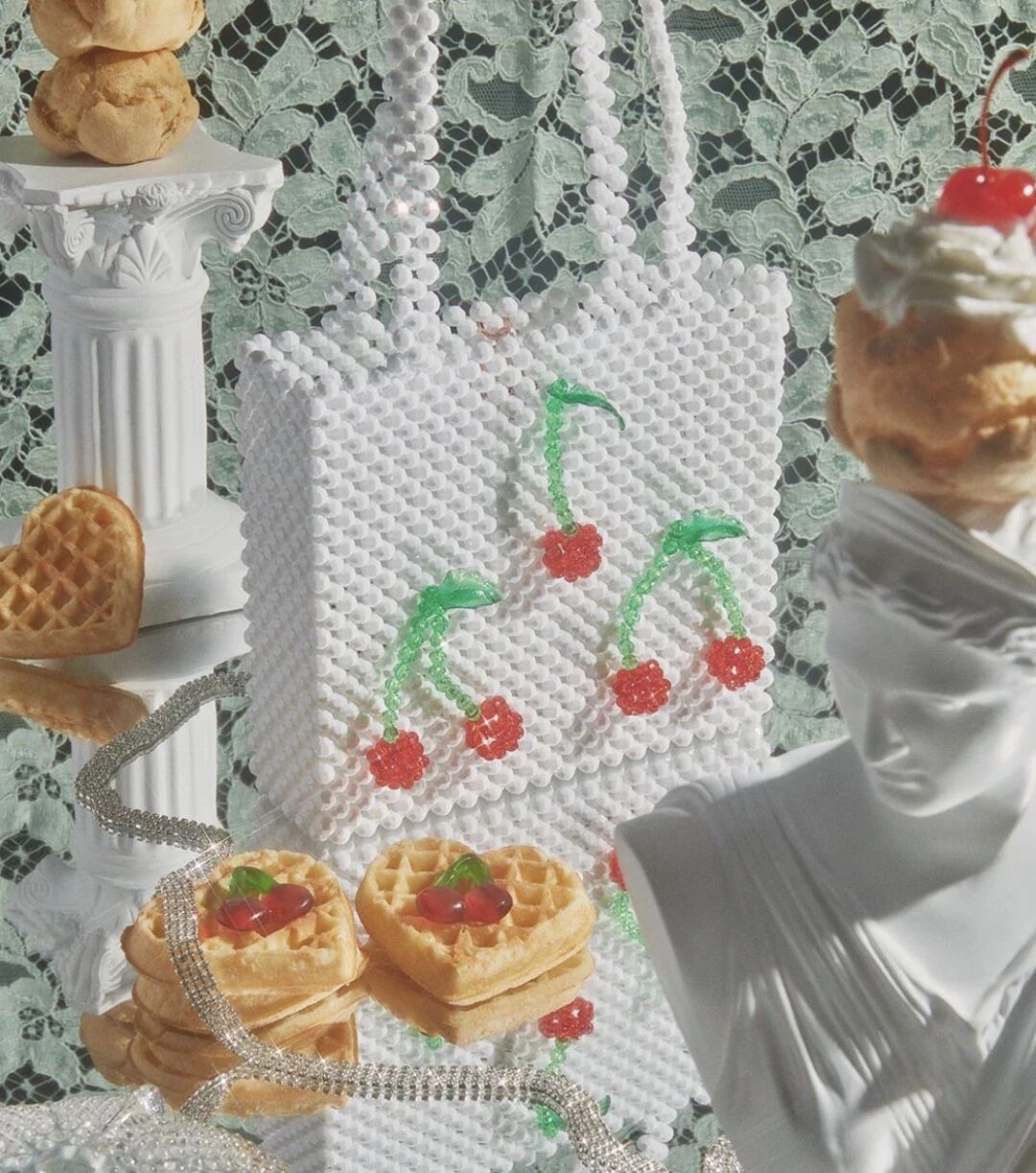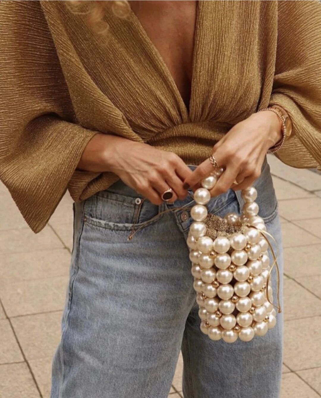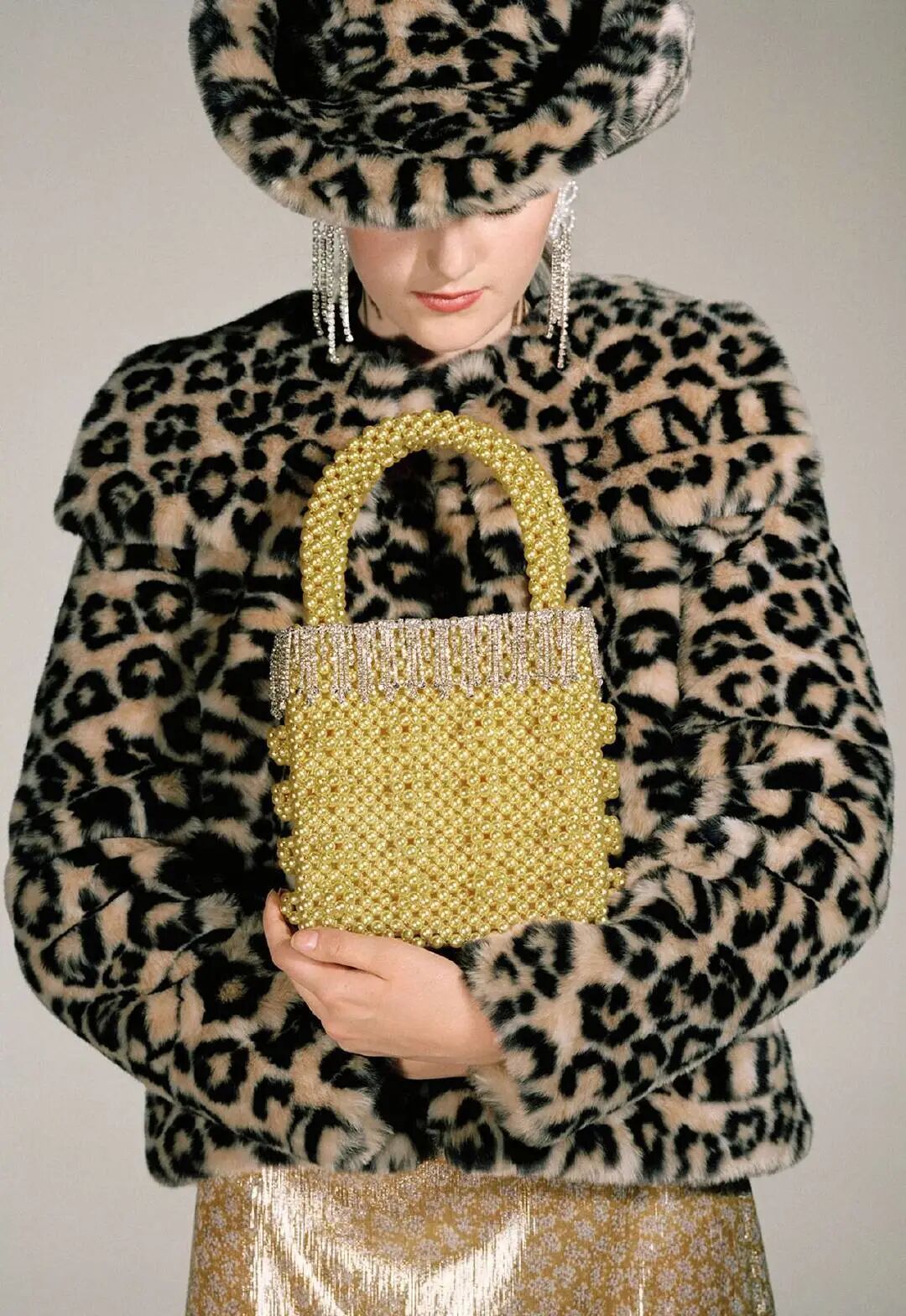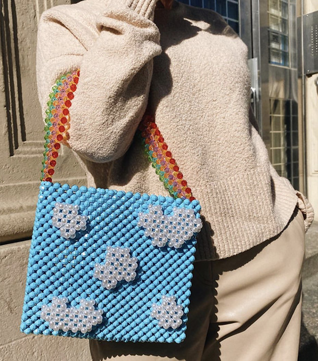 除了传统的皮质、线型编织,还有各种以亚克力和珍珠为原材料的编织成包包也很受欢迎,估计大家看到这款方方正正的珍珠包都会觉得有些眼熟吧。