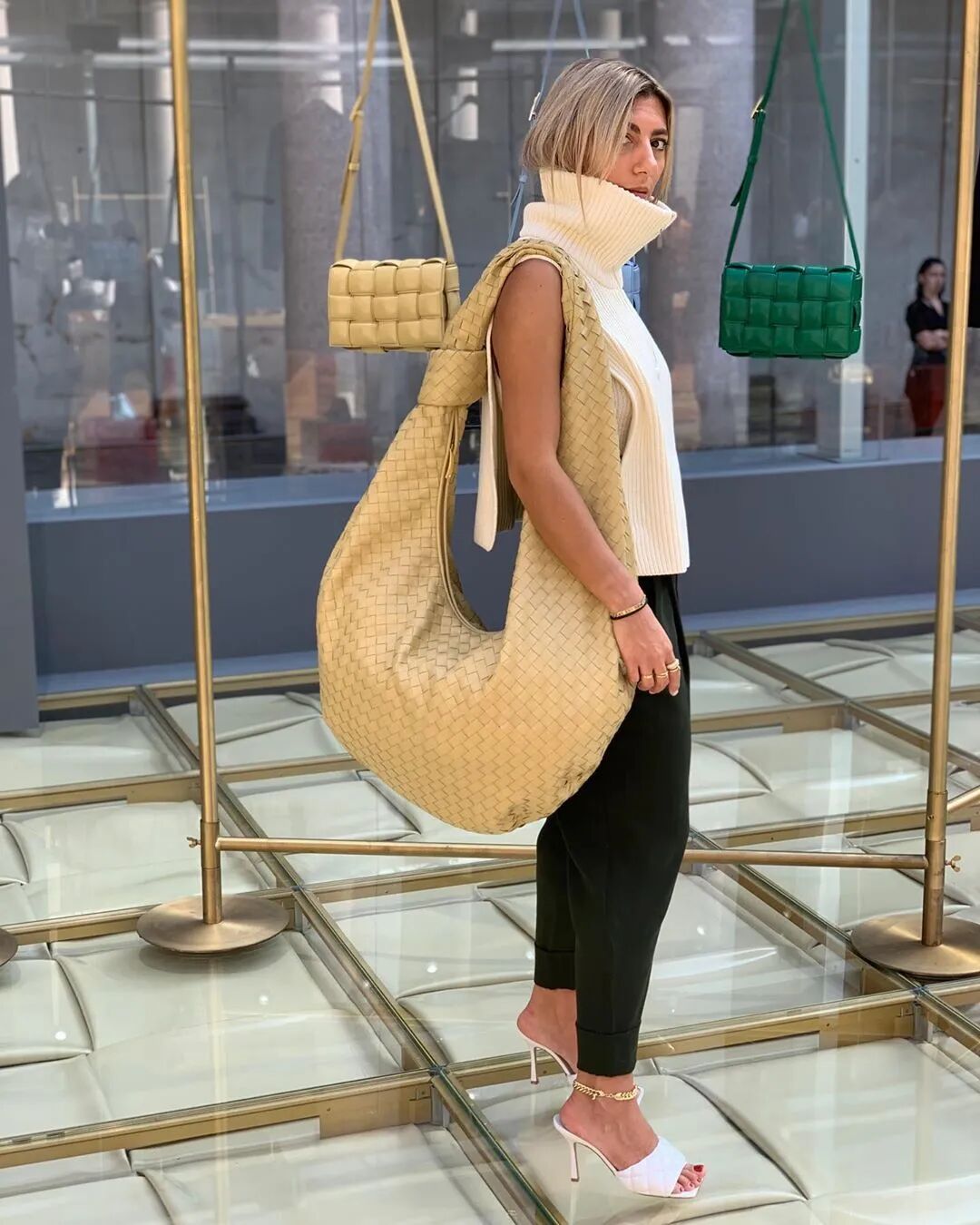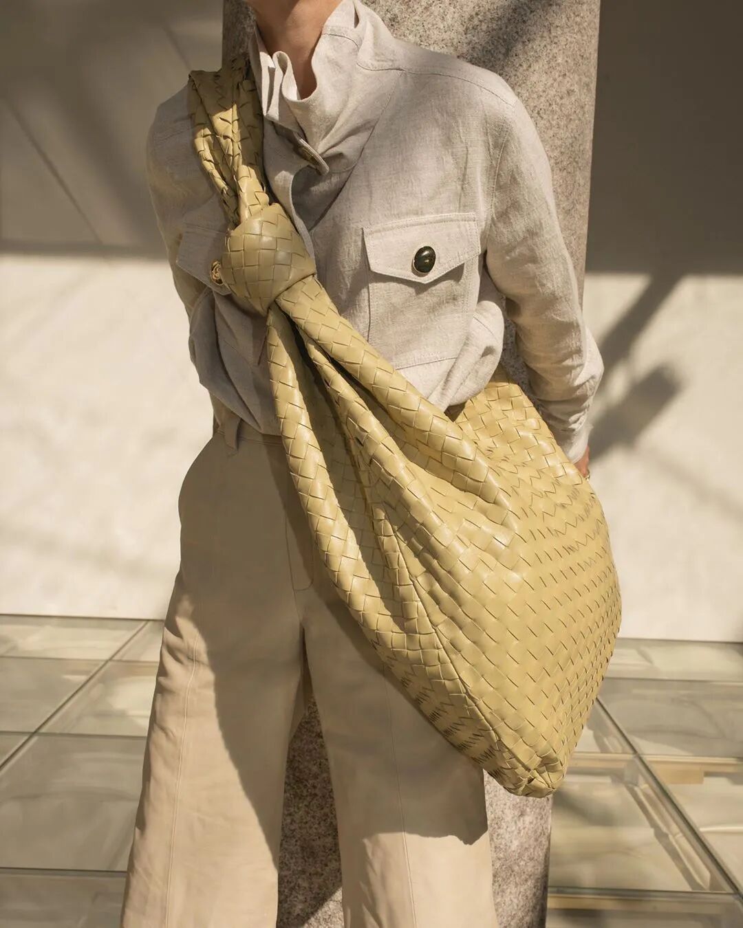 最先拥有姓名的必须是Bottega Veneta了,毕竟它靠编织起家并且如今已经火到一塌糊涂,在2020春夏时装周的秀场外,Bottega Veneta的这款BV JODIE手袋也一直在刷着存在感。