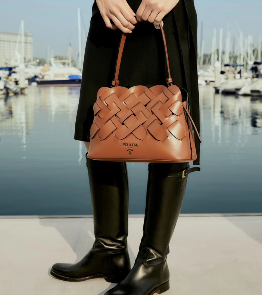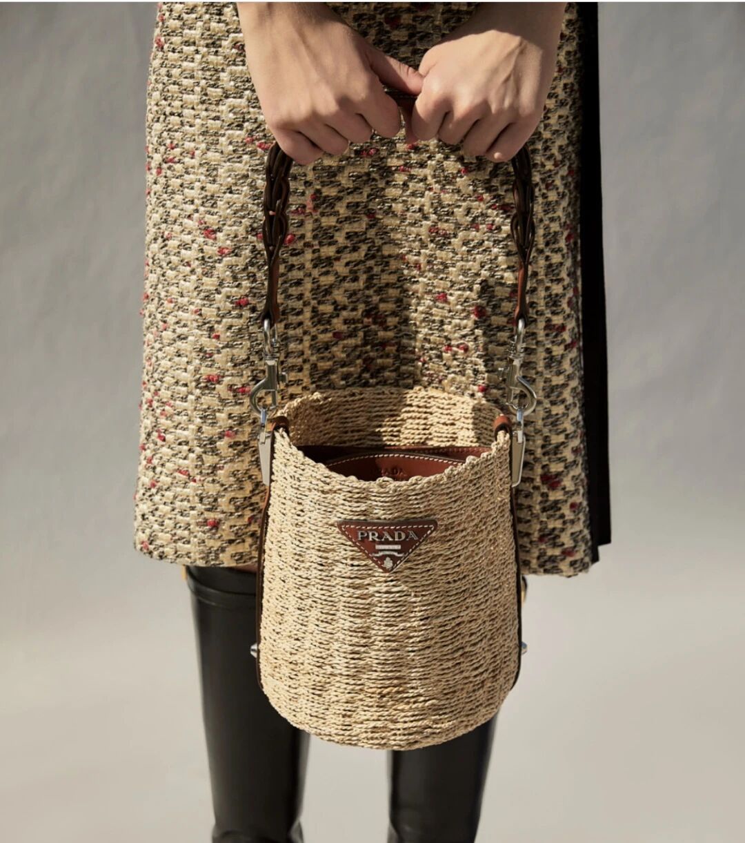 顺便说一下,这次Prada还出了一款“草编”的水桶包,不过事情远没有想的那么简单,这款草编包实际上是由经过处理的玉米壳和编织皮共同制成的包包,很环保也很有意义!
