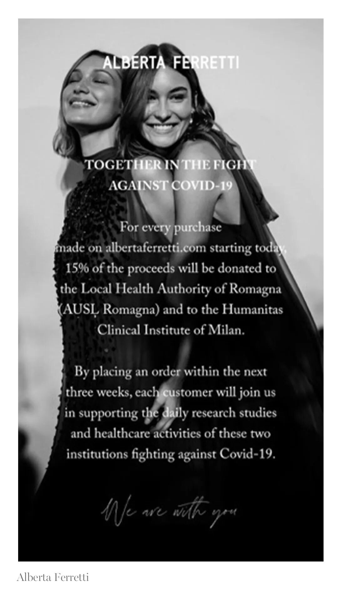 一直以女性力量为底蕴的意大利品牌Alberta Ferretti在抗疫方面也做出了响应。品牌宣布即日起,Alberta Ferretti官网每笔订单额的 15%,都将捐赠给罗马涅地方卫生部门和米兰的人道主义临床研究所,用以抗击疫情与疫苗研发,和顾客们共同对抗新型冠状病毒。