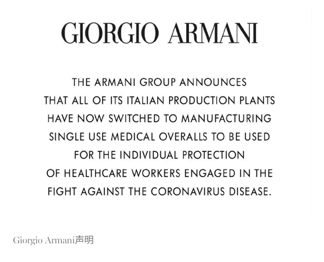 此外,2020年3月27日, Armani集团宣布,其所有意大利生产工厂现已转产一次性防护服,旨在为抗击新冠肺炎的医护人员提供个人防护。