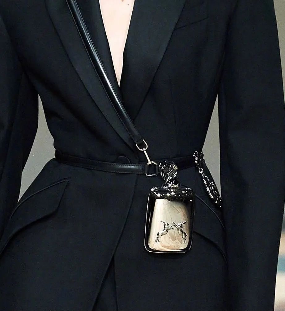 就算单挂一只小包也很可,Alexander McQueen选择在腰带上挂一个金属质感的小包作装饰,闪闪的让造型更加果敢。
