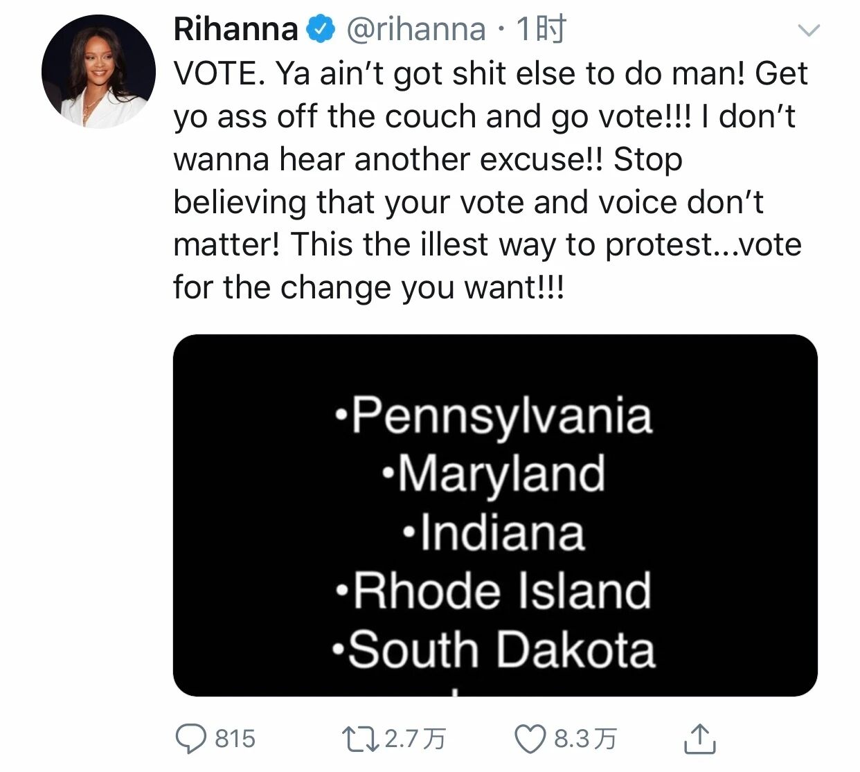 除此之外Rihanna还承诺向两大非裔组织捐款,并呼吁大家一定记得在总统大选时投票!为自己想要的改变而投出自己的一票。