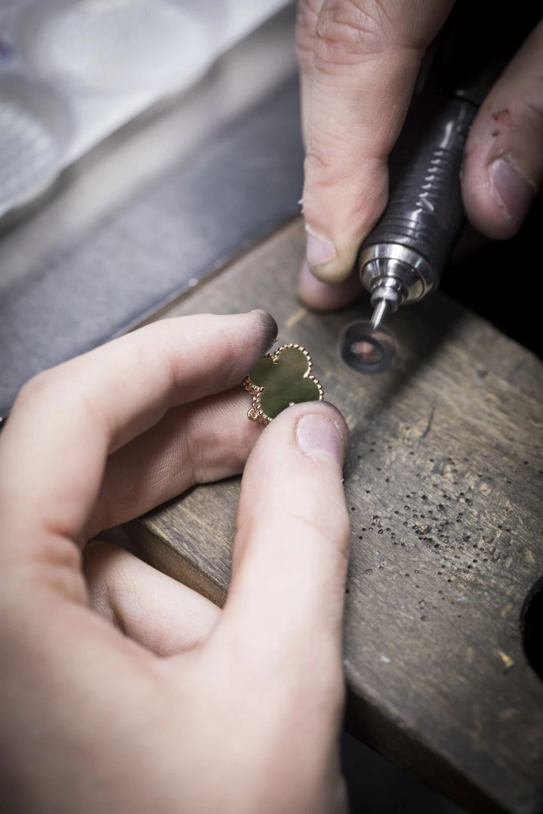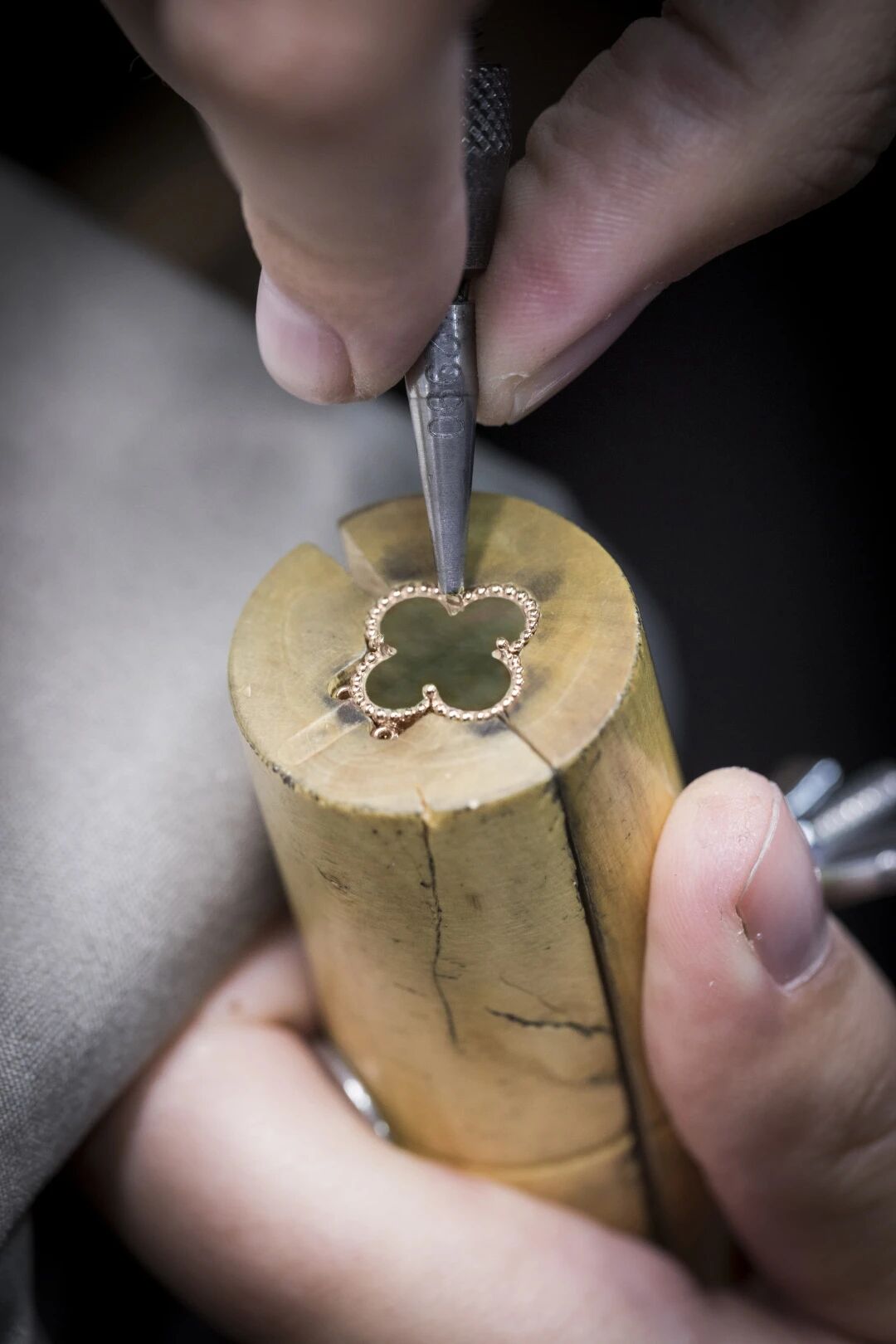 除了美观度满分,工艺也是相当的精湛,圆珠饰边由珠宝匠手工打造,再将宝石图案固定于金质镶座上,并细心固定镶爪位置等,不少于15道的工序,也是很👍。