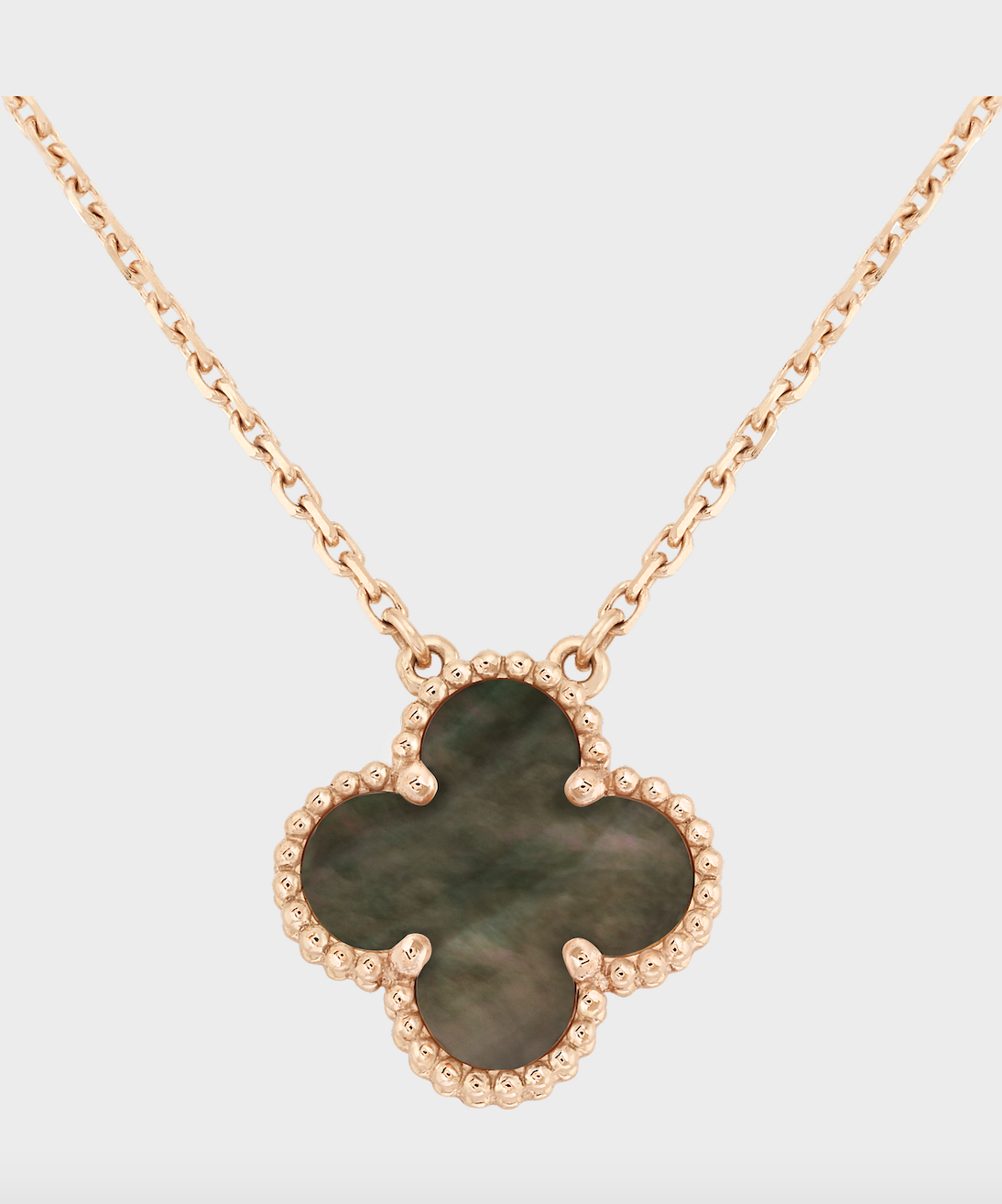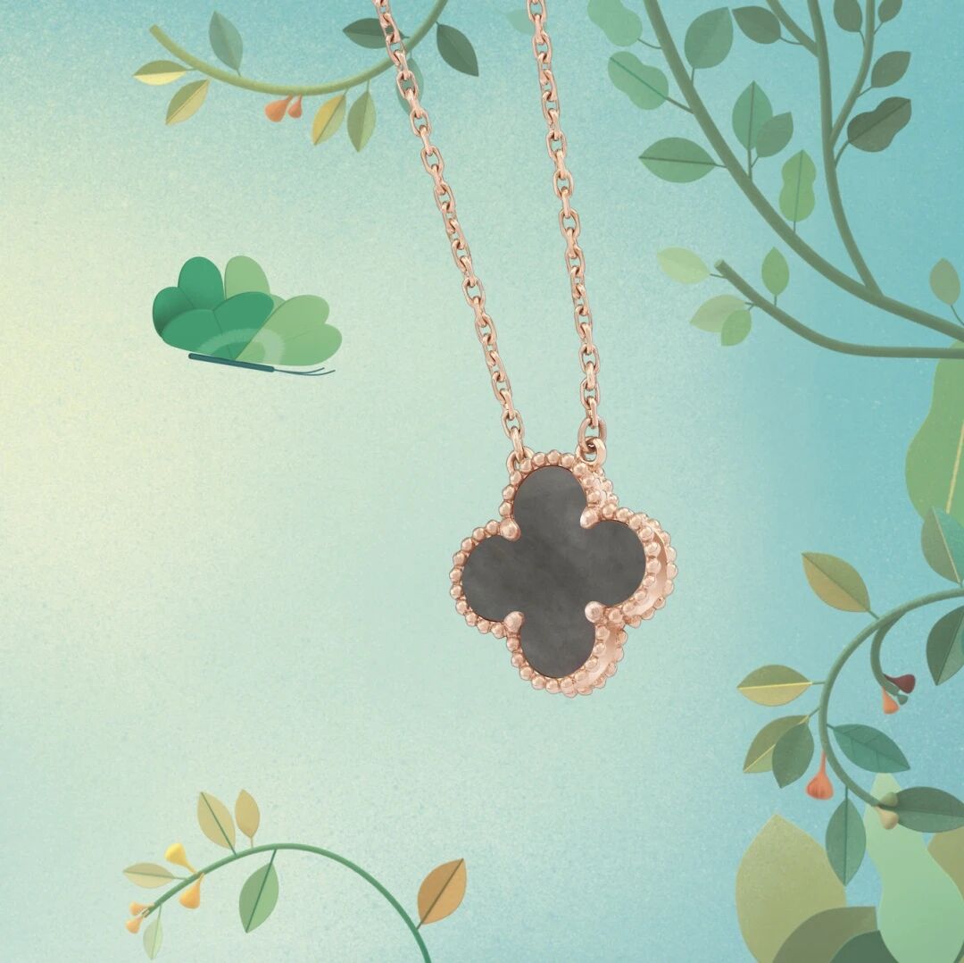 四叶幸运图案还是那么经典~产自法属波利尼西亚的灰色珍珠母贝,除了色调和谐柔美,光泽感也很完美。玫瑰金则是以黄K金、铜及银合成。