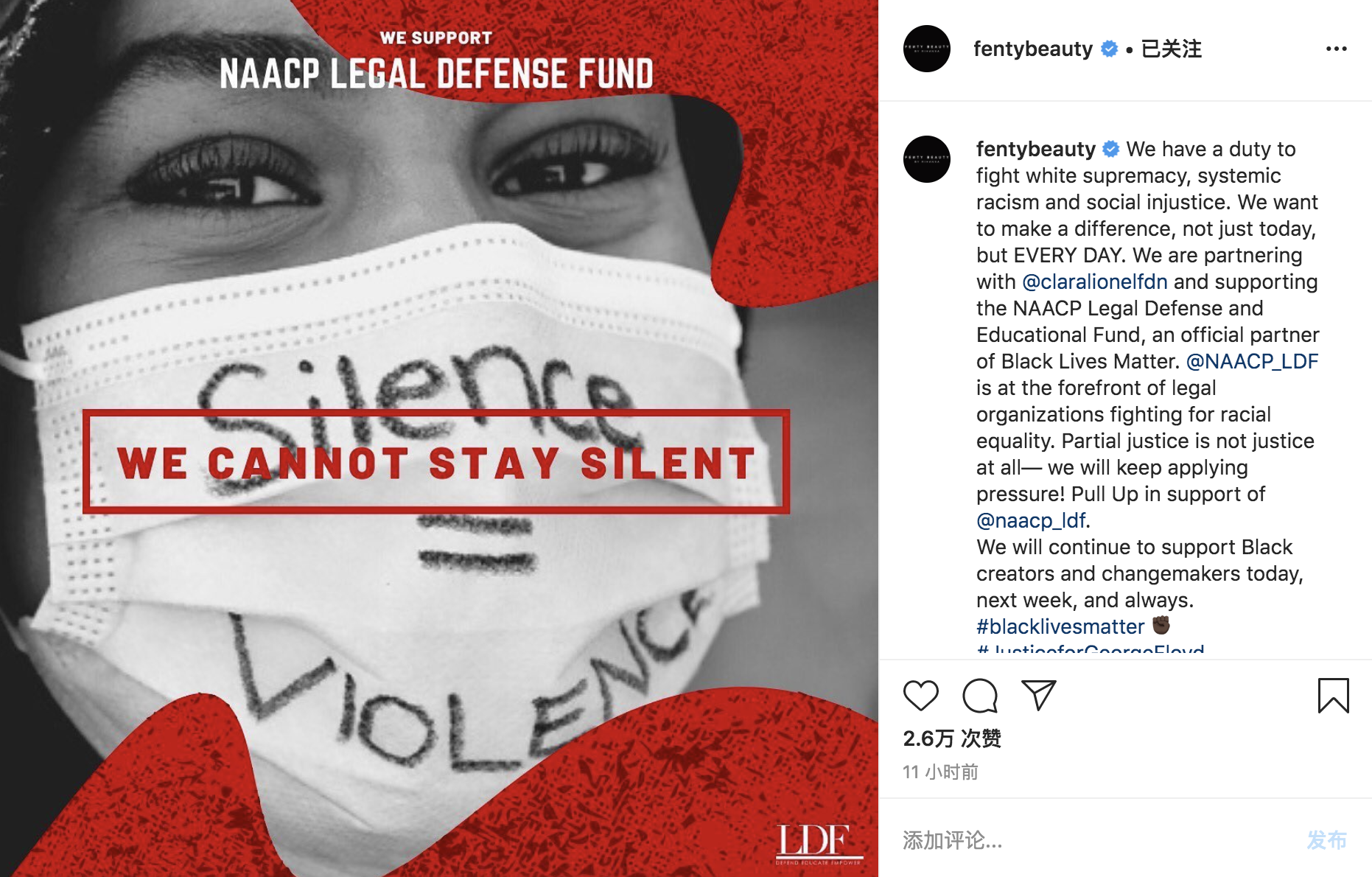 Rihanna除了在主页连发三条内容强势声援,旗下的品牌包括FENTY、Fenty Beauty和Savage X Fenty也同时发帖。