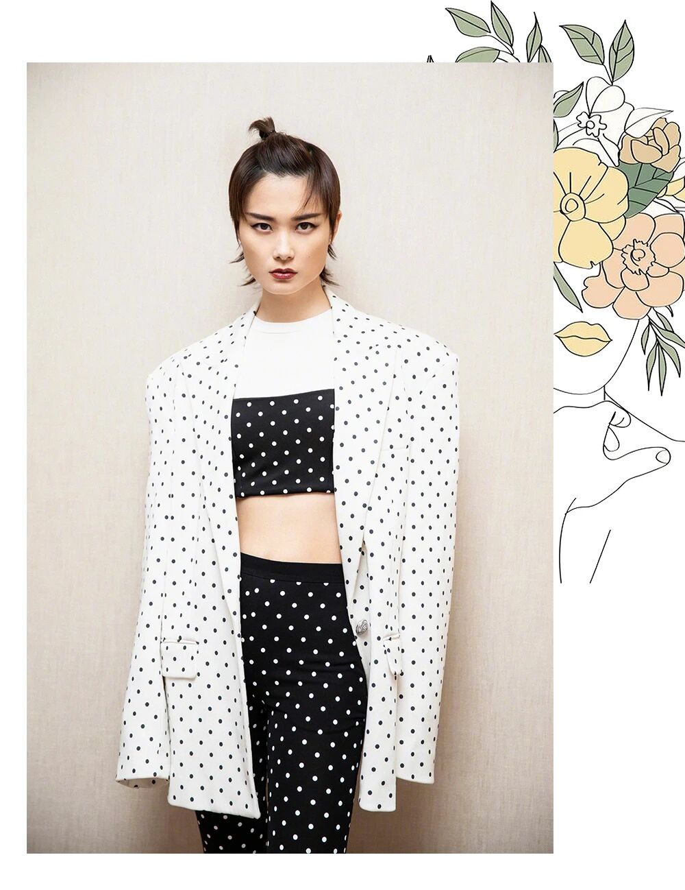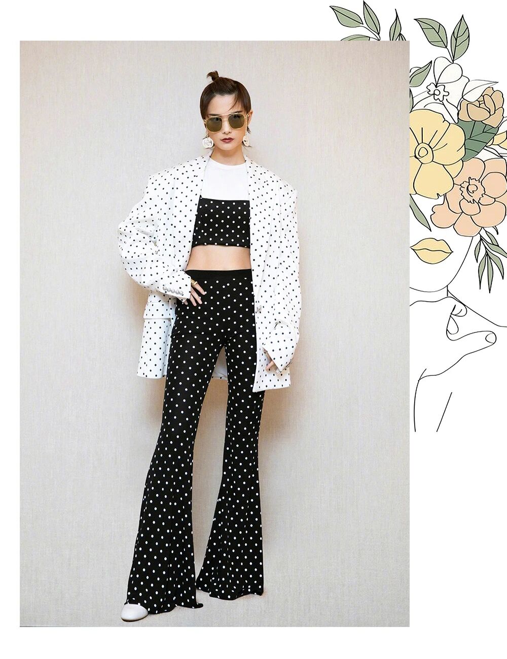 就算是全身照搬Balmain的T台look,李宇春也抖出了自己的酷飒。Oversized西装和喇叭裤原来是如此绝妙的组合,将60年代的嬉皮和80年代的中性完美结合,经典的黑白也因为波点产生了奇妙的化学效果。