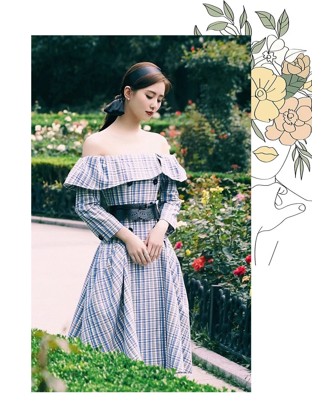 诗诗的这身格纹也完全没有小家子气,大翻边的荷叶一字领和整整齐齐的纽扣体现着Wes的现代美学,诗宝的镂空雕花皮革腰封配得也是有一丝霸气了。