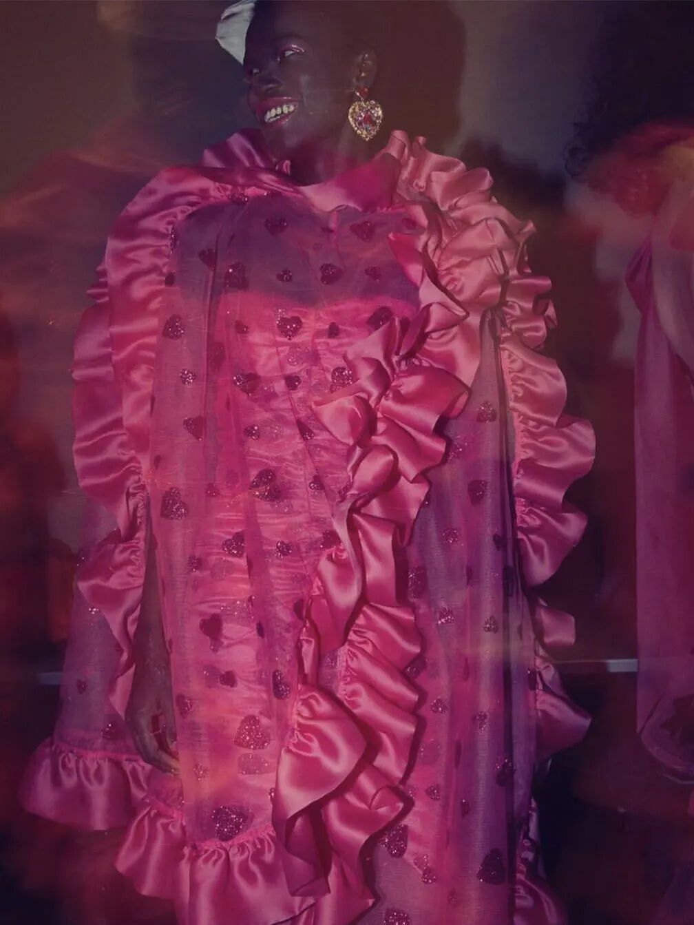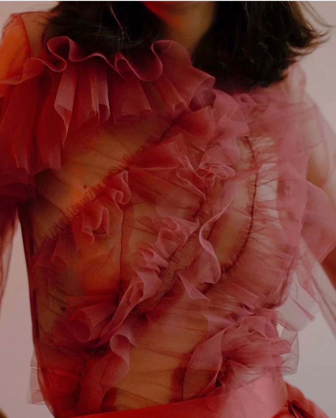 另一套相对没有那么强势的荷叶边长裙,透出更多的是一股文艺感,梦幻薄纱与压褶设计相结合,性感之中不乏清新的味道。