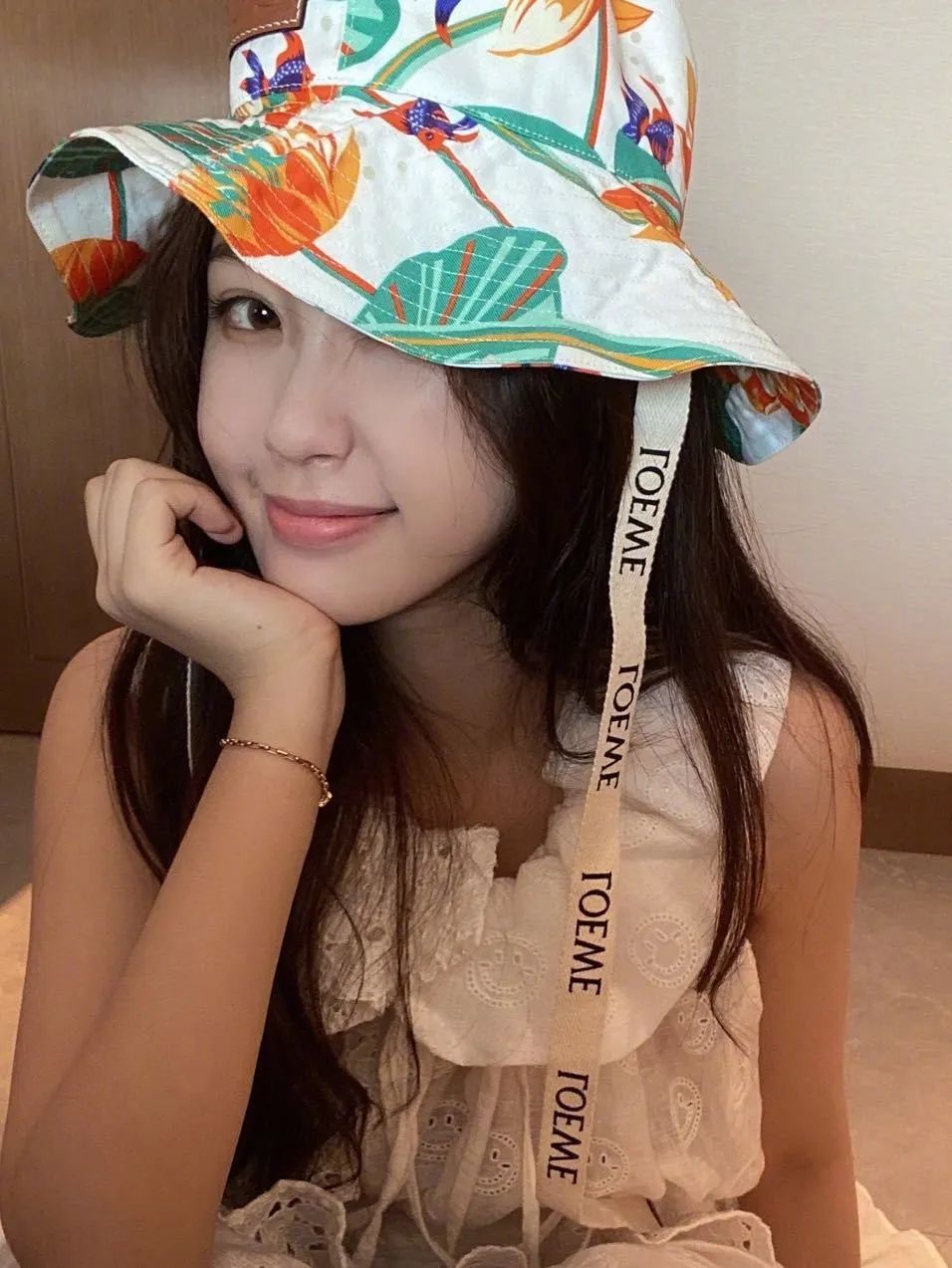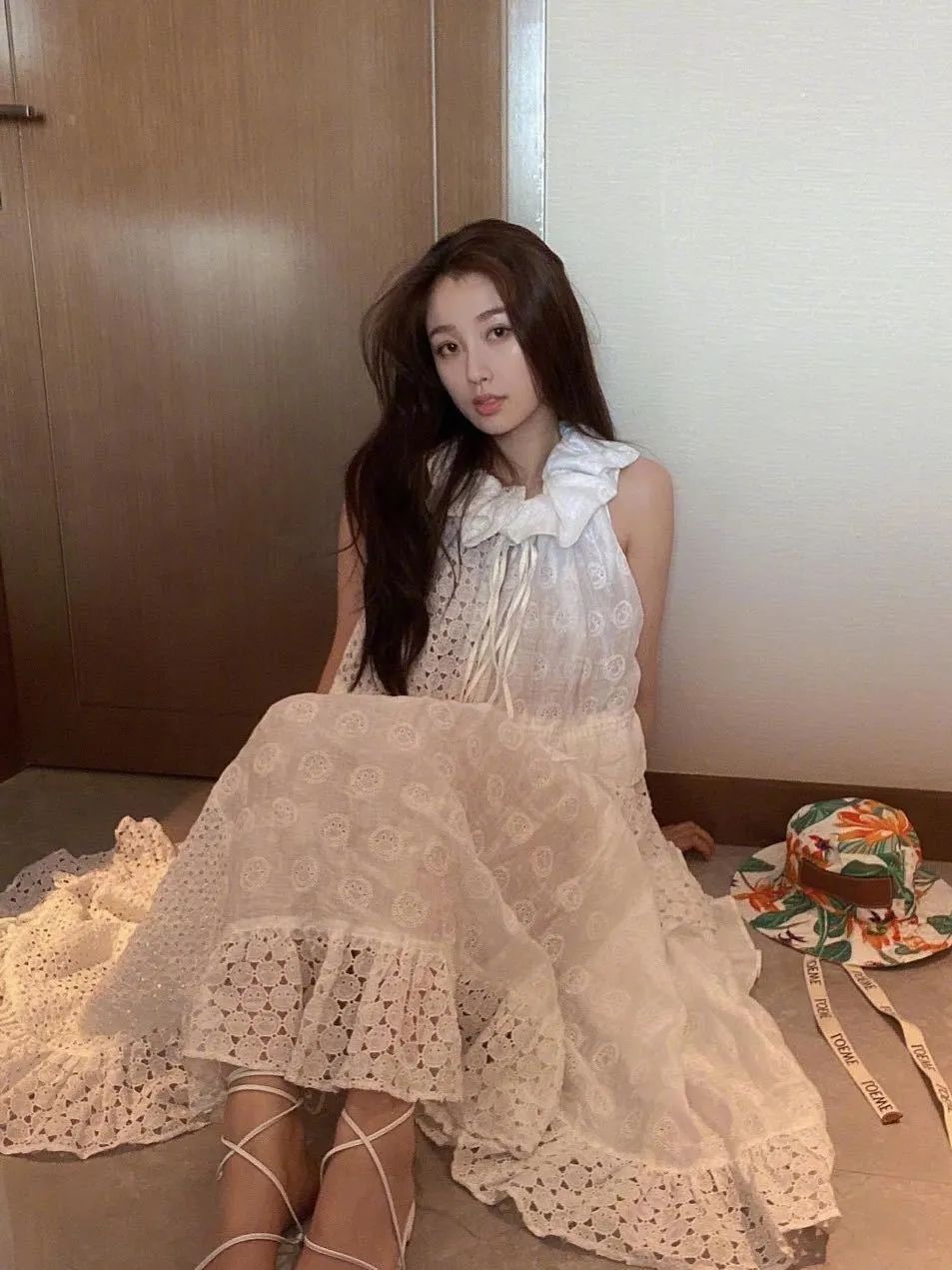 稍早一点之前,她还穿了一套白色的镂空长裙,在LOEWE沙滩渔夫帽加持下,在家里就完成了一场“地中海度假”。