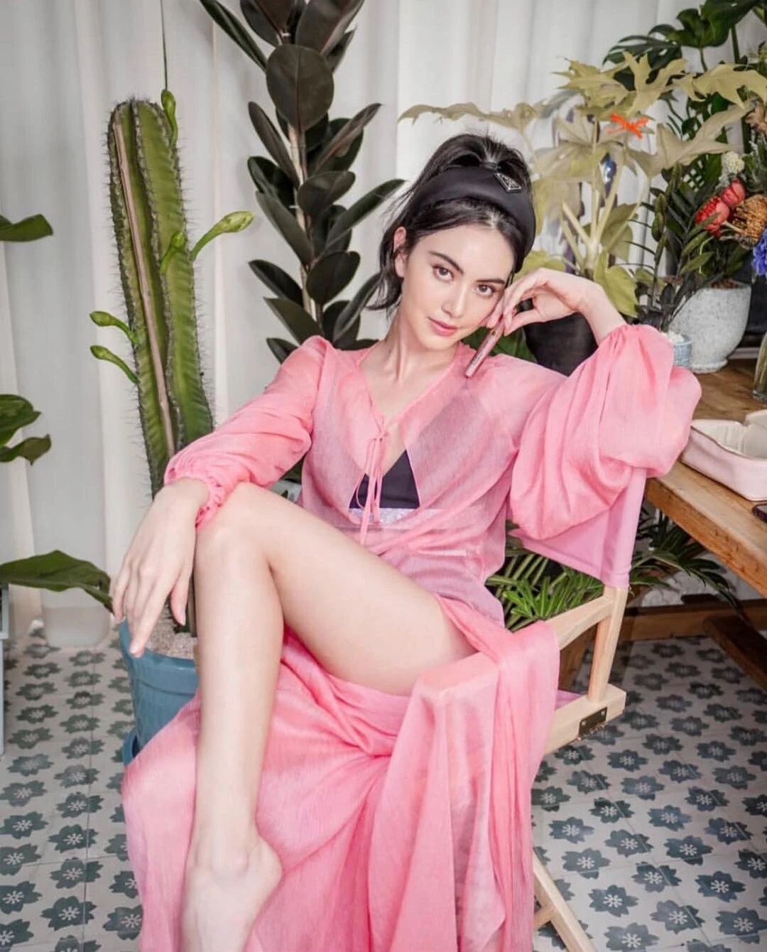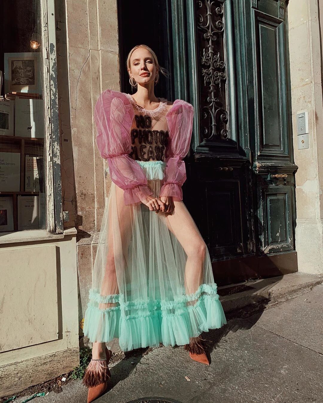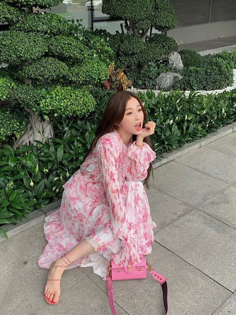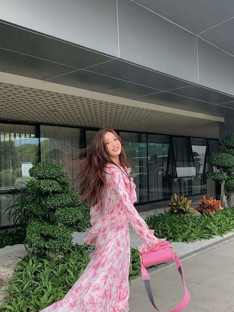 欣欣子最近分享的几套Look走的都是这个路线,身穿Philosophy连衣裙的她,搭配同色系的Balmain芭比粉包包,看起来又软又甜。