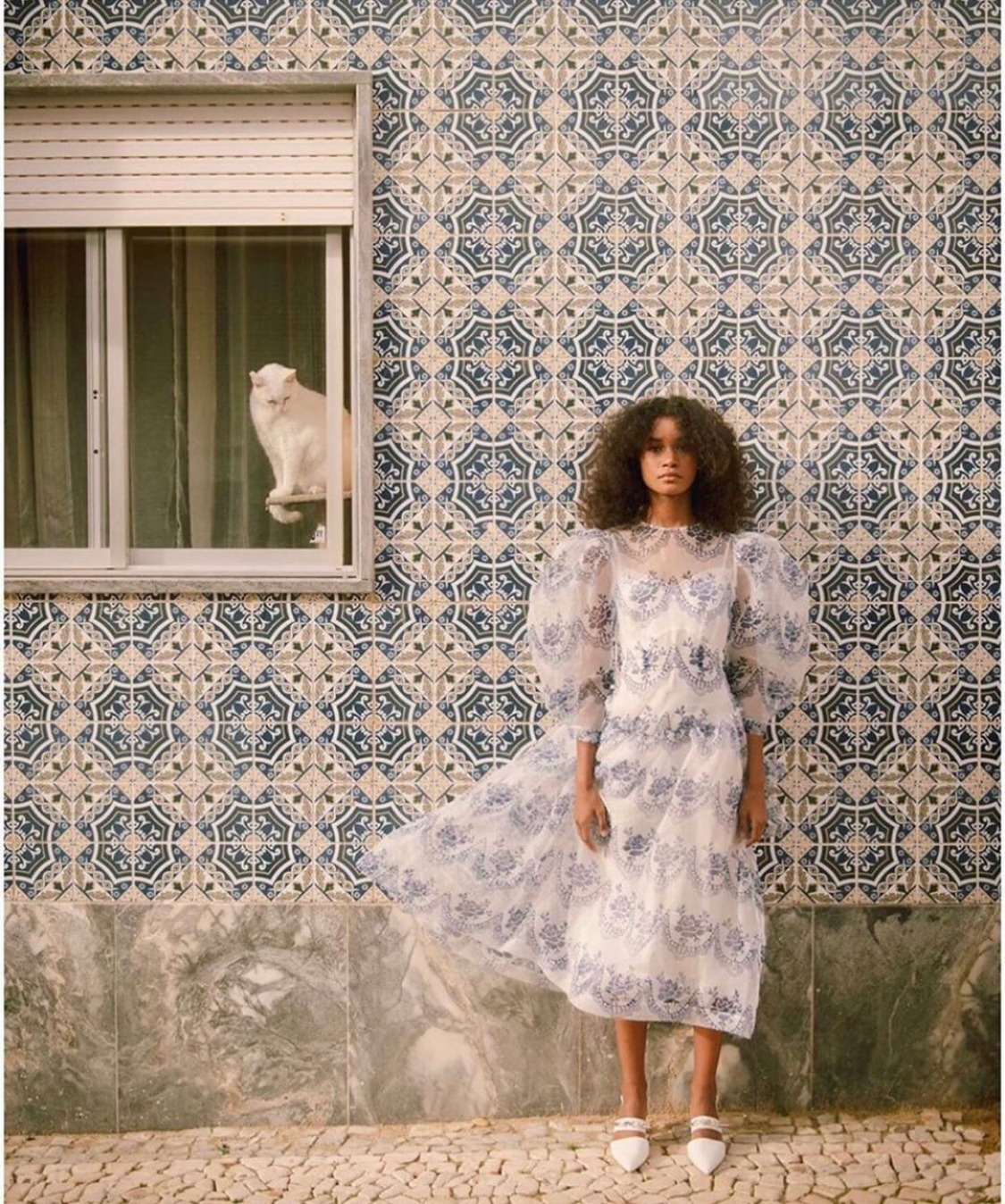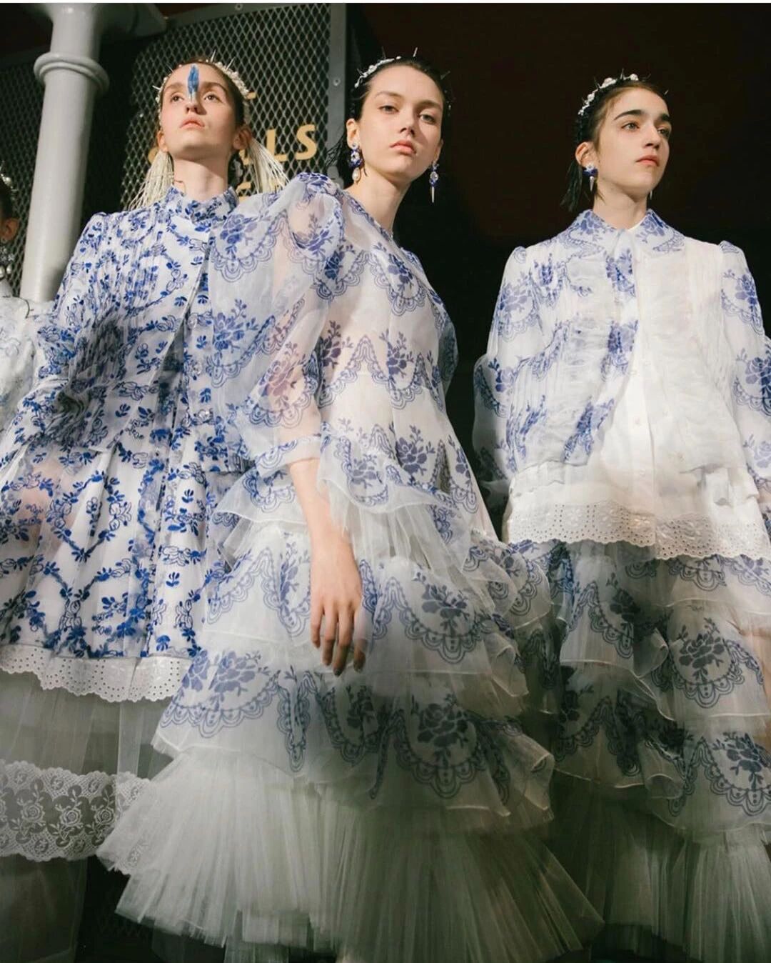 说到仙气,这回将东方文化带到时装舞台上的Simone Rocha也值得一提,以细腻的蓝色刺绣、印花和白底纱织面料荷叶边勾勒的廓形长裙,一出场便惊艳四座。