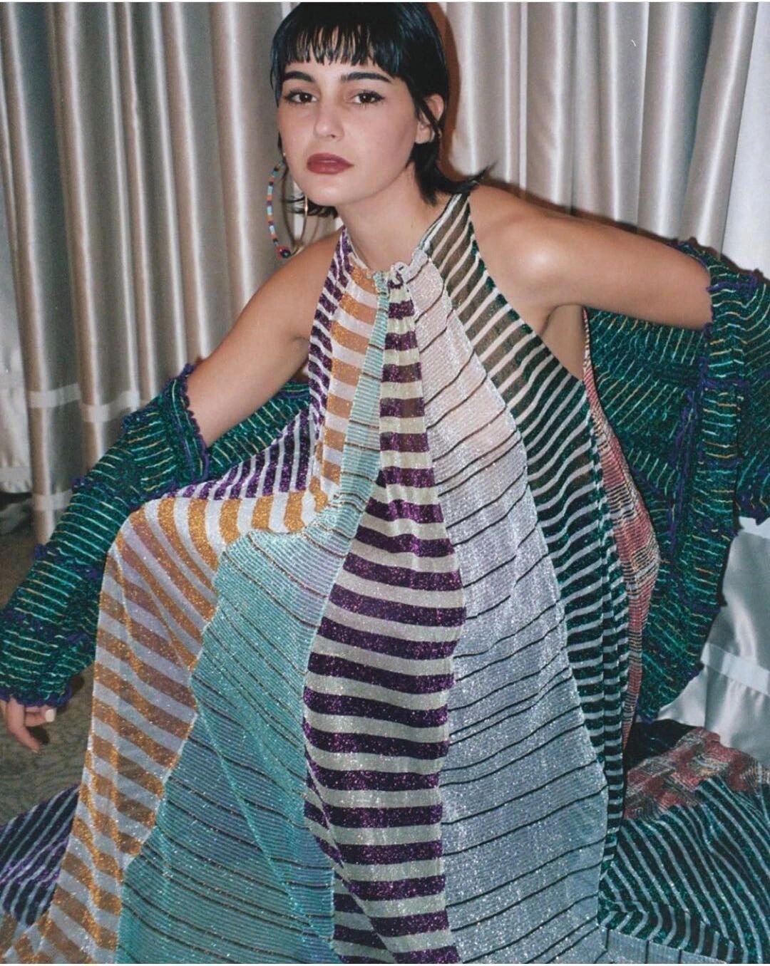 同样,时装博主Maria身穿的Missoni金葱丝度假连衣裙也有着异曲同工之妙,织造的时候加入了金线或银钱,营造出来闪闪亮的感觉,在暗夜下尤为耀眼。