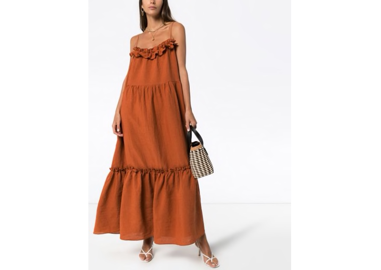 实际上,这款长裙来自Zimmermann,与它家之前火到人尽皆知的宫廷风长裙有所不同,设计师这回从荷叶边营造出的层次感汲取灵感,配合极有女性的剪裁,来凸显出长裙的廓形感。