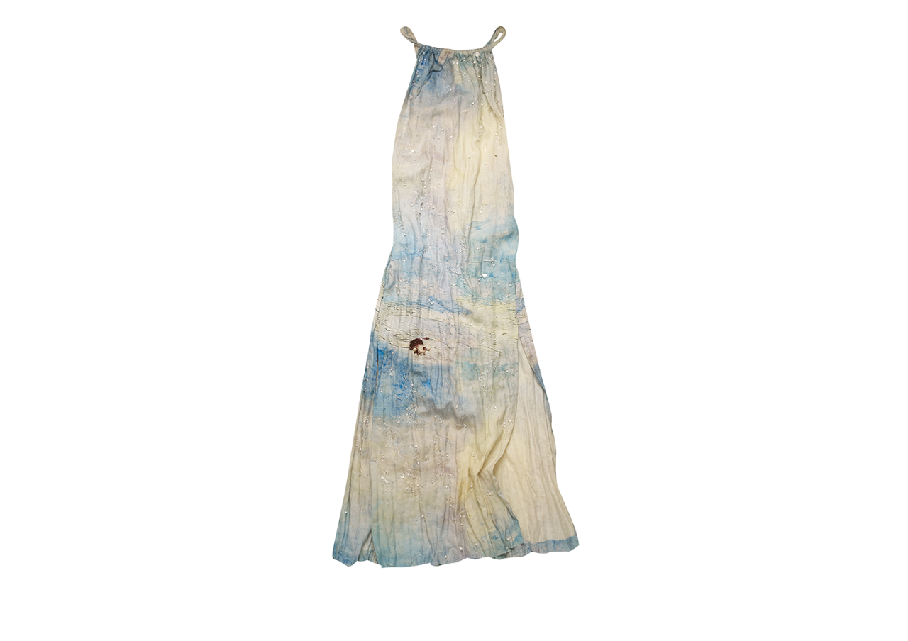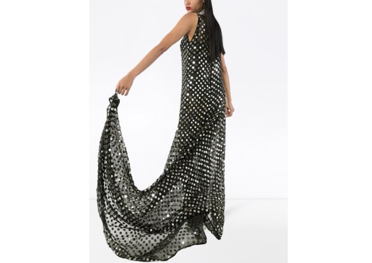 而它更耀眼的地方,实际上是服装本身的含义,这款长裙以海洋健康为灵感来源,颗颗细小的水钻,代表着阳光映射下发光的水面,警醒大家由于全球变暖,水面上涨的问题。