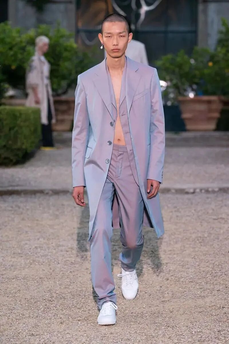 Givenchy 2020秋冬系列中,与Onitsuka Tiger联名推出的运动白鞋搭配镭射面料西装,前卫与复古的巧妙搭配。