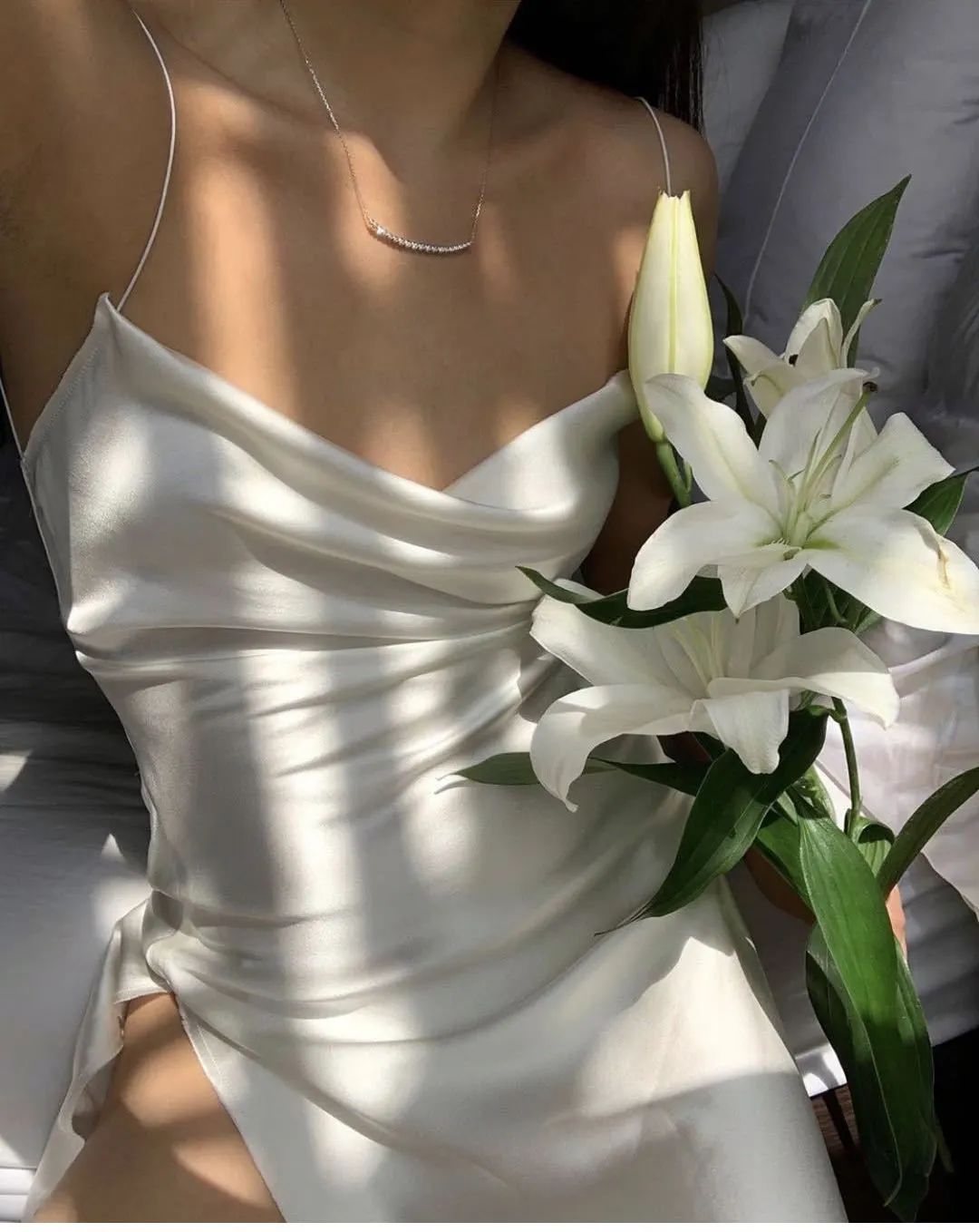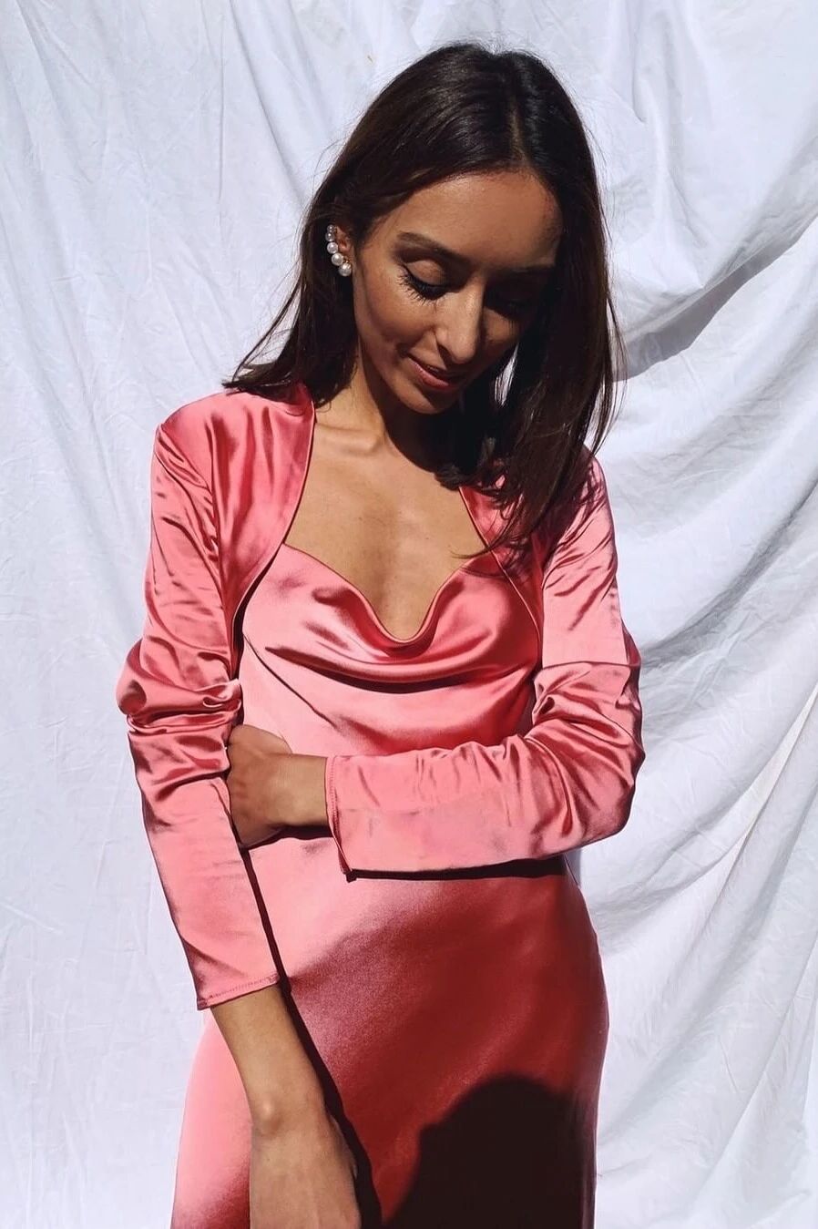 带有光泽感的缎面材质面料精致刻画出女性窈窕的身材线条,利用面料带有垂坠特性,更好的将堆堆领设计展现到极致,散发出性感和慵懒气质。