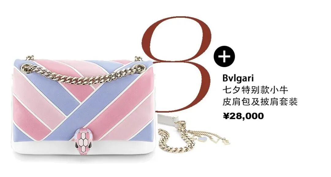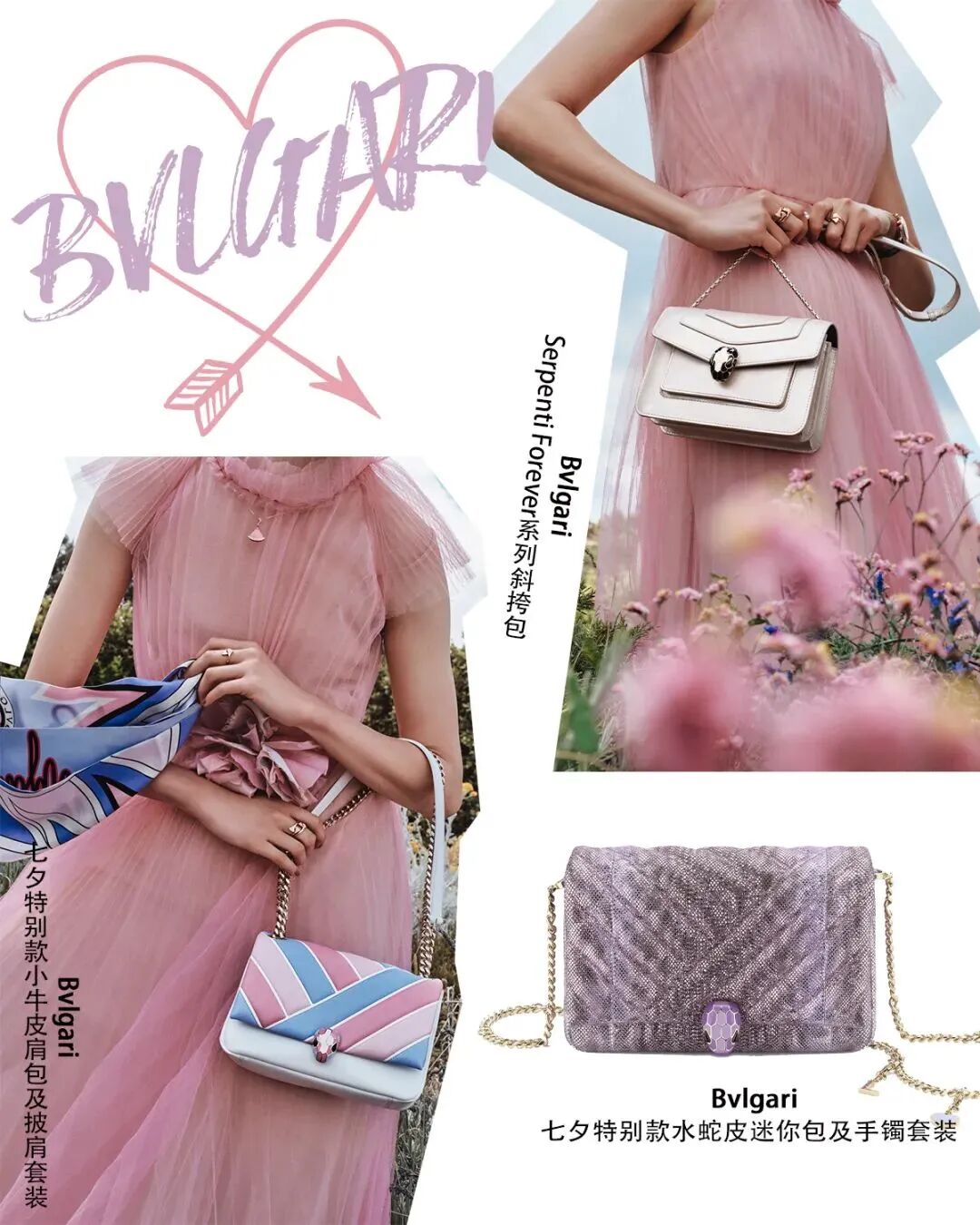我们的爱情是彩色的,就像宝格丽七夕特别款小牛皮Cabochon手袋,标志性蛇头搭扣大胆选用粉色和紫色相配,温柔甜美。水蛇皮Cabochon迷你包则采用金属质感的水蛇皮,个性中透露着些许妩媚。