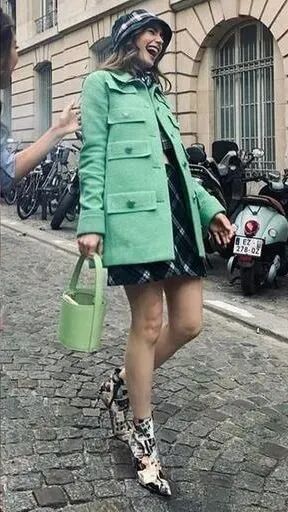 加上Kangol绿色格子帽及同色裙子,手拎Staud浅绿色水桶包,整个造型是高贵优雅的Vintage风。