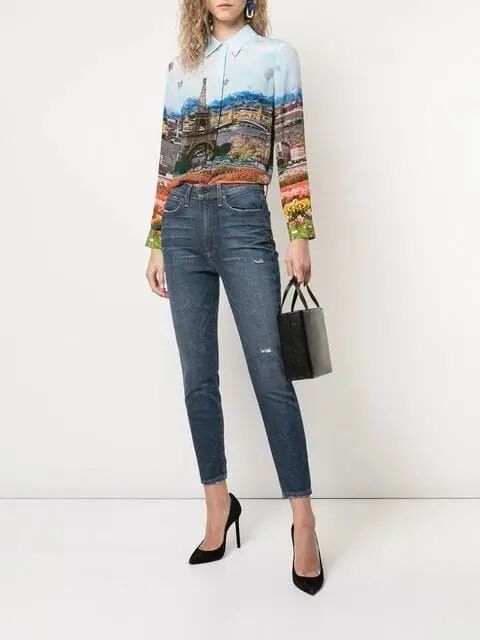 除了Tone-on-Tone 的搭配风格,时尚教母对于印花单品的运用也是手到擒来。这款真丝衬衫的拼贴印花融合了经典的法国标志——埃菲尔铁塔,与剧名相呼应的同时,复古又摩登。