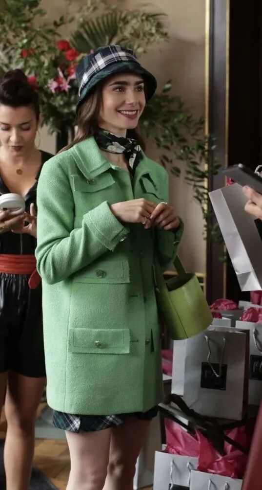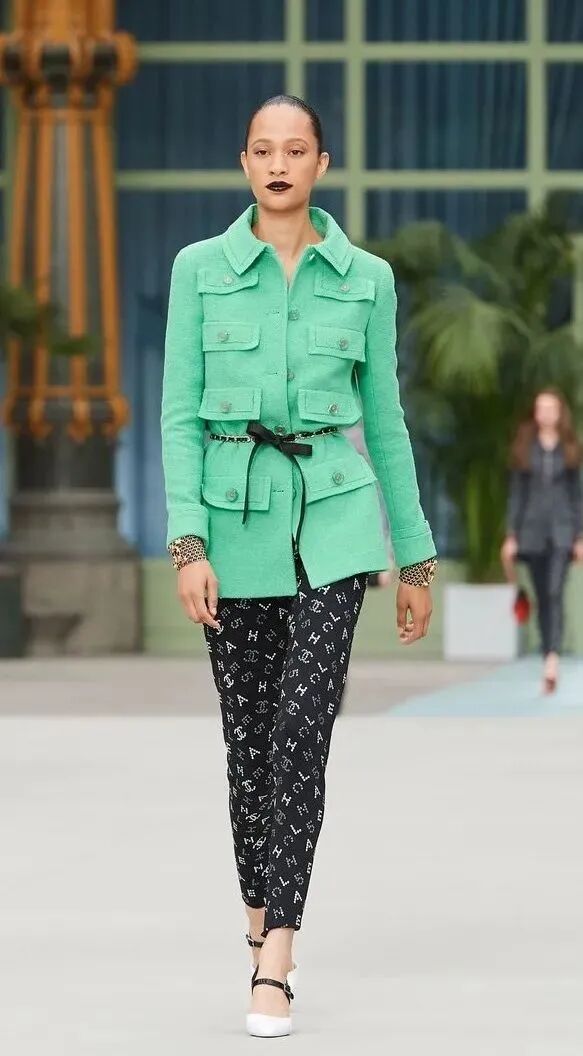 除了鲜艳的红色系,不易驾驭的全绿色系居然也出现了。从剧照中我们可以看到Lily身穿Chanel resort 2020加大版型的薄荷绿色外套出现在队伍中,清新淡雅非常的亮眼。