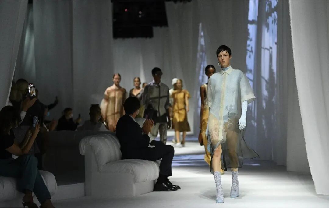 来到秀场,传统元素和居家生活的灵感细节也融入了现场布景之中,白色的窗帘随风飘荡,营造出空灵的透视感。