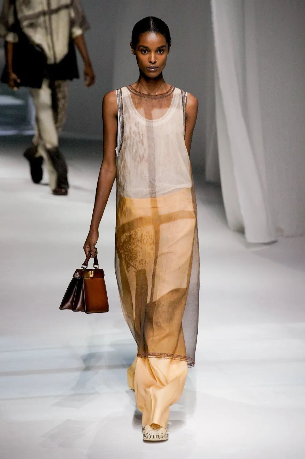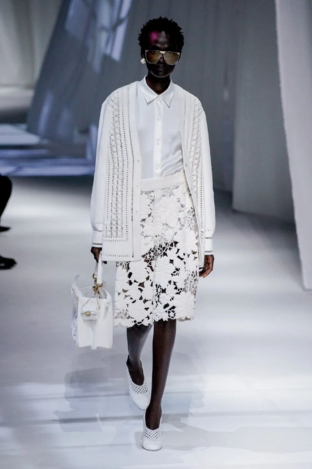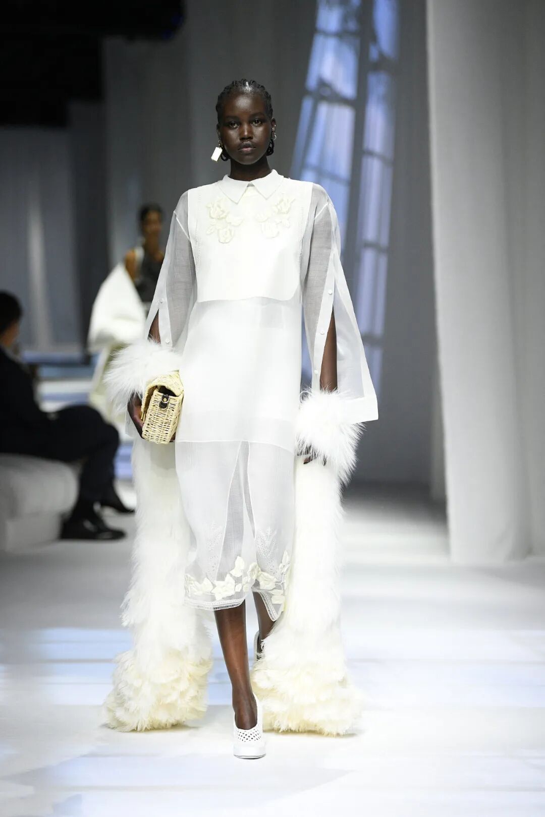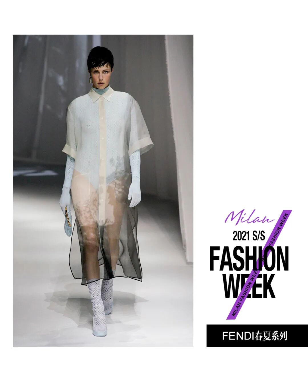 开场便点出了本季最引人注意的光影元素。白色窗帘在飘动之间与灯光投射出树木、飞鸟等生活意象,Silva Venturini Fendi女士在居家期间经常注视着窗外,并发觉有许多被忽视的“美”。她选择将它们定格成极富空灵美的抽象花纹,以“影子”的方式成为服装上的印花,又运用薄纱材质模拟了轻盈灵动的光影投射效果。