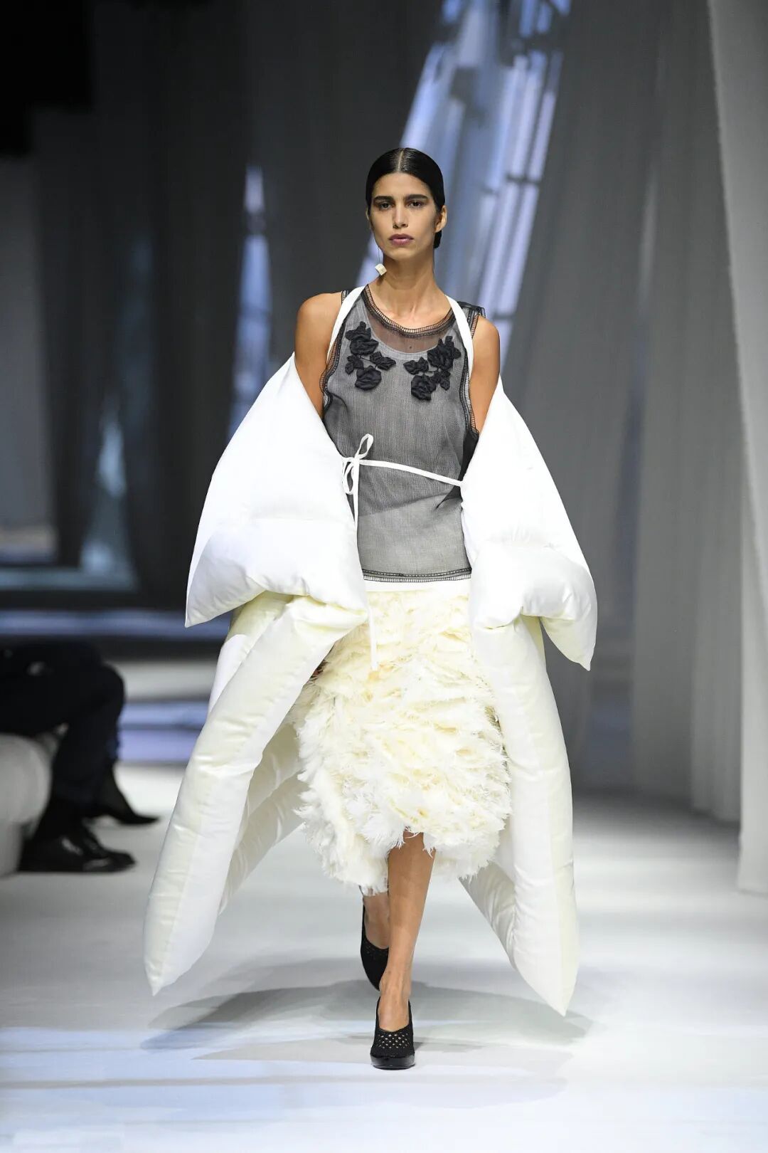 羽毛和衍缝羽绒面料也是本季的亮点之一。轻与重、仙气与温暖之间矛盾又互补的结合为整场秀注入了更多的浪漫气质。看似跳脱的意象背后依然承载着那些代代相传的日常事物——床品、家居装饰、捕梦网……