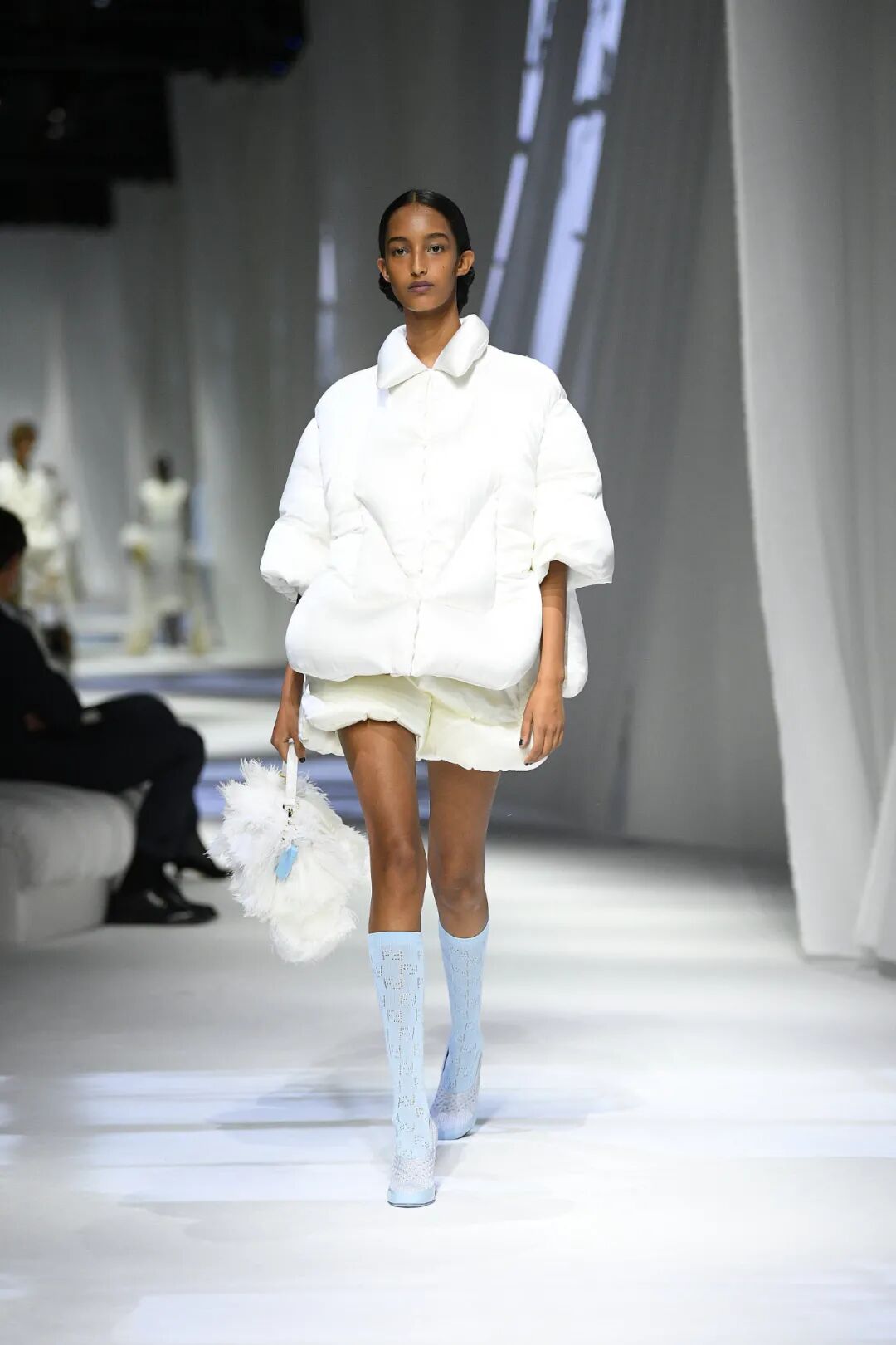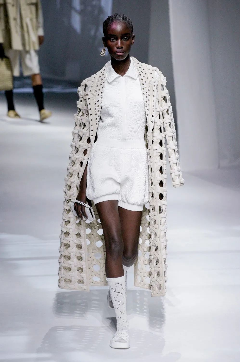 色彩方面,Fendi本季亦选取了多种富有“日常”之美的色系。如十分治愈的小麦色、奶白色、蜂蜜色、天蓝色等,如同透明的水彩画般澄澈。而红黑白的经典三色,亦同廓形时髦的剪裁相得益彰。