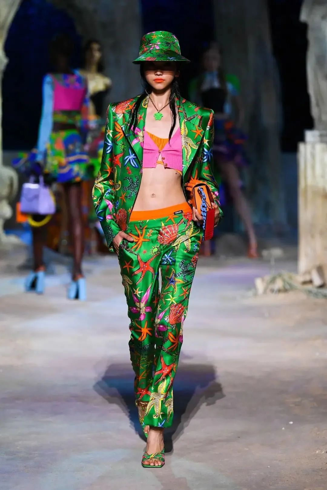 在Versace 2021春夏大秀中,我们看到了老朋友贺聪,这次的她,以一身橘色的标志性海洋生物印花西服套装绚丽出场,散发着如同美杜莎般强大的自信魅力。