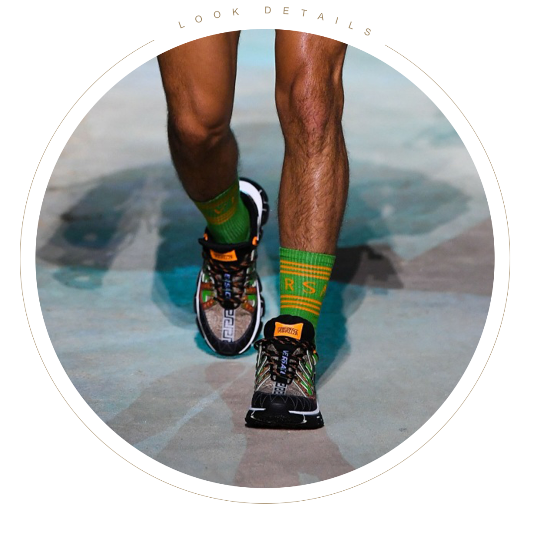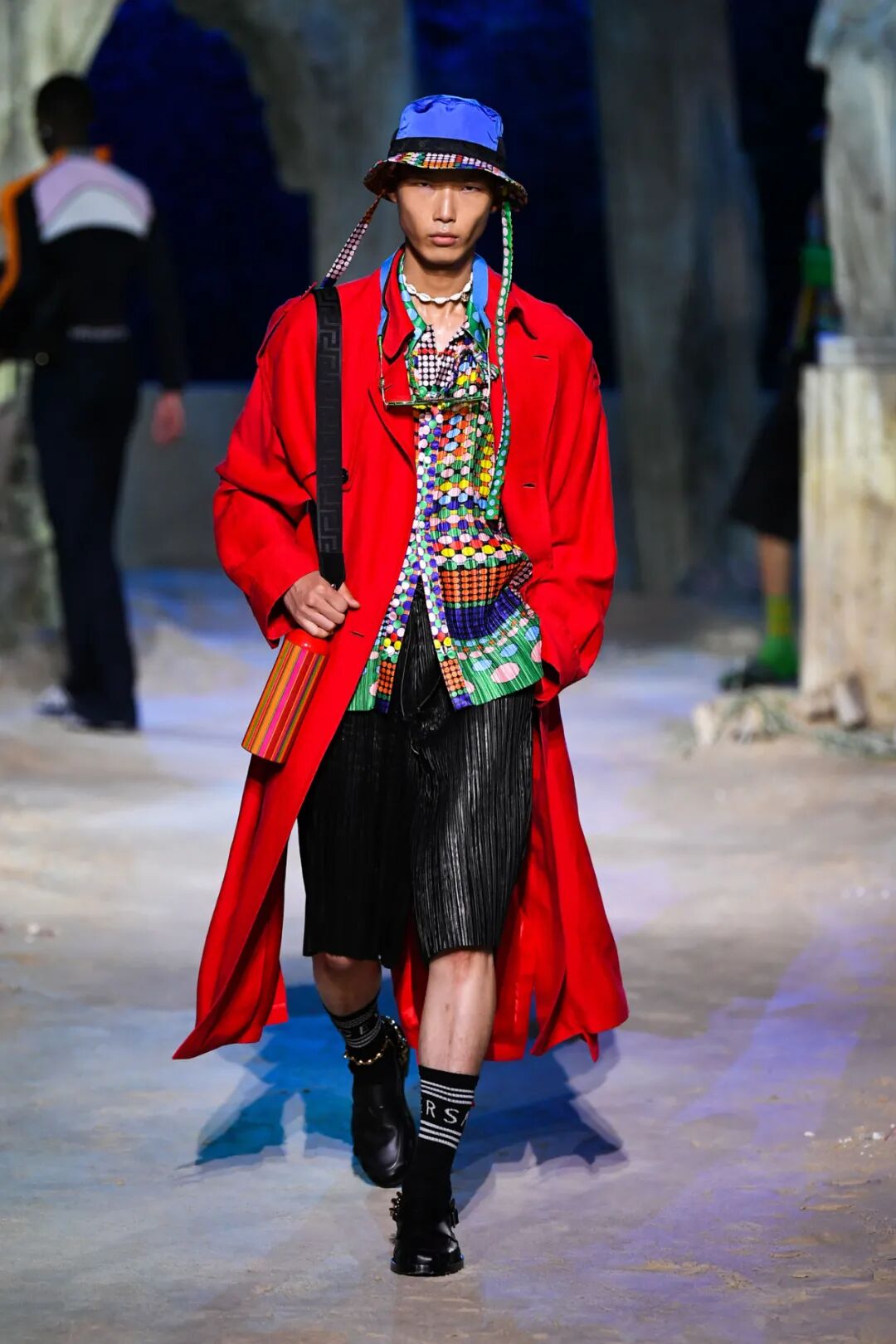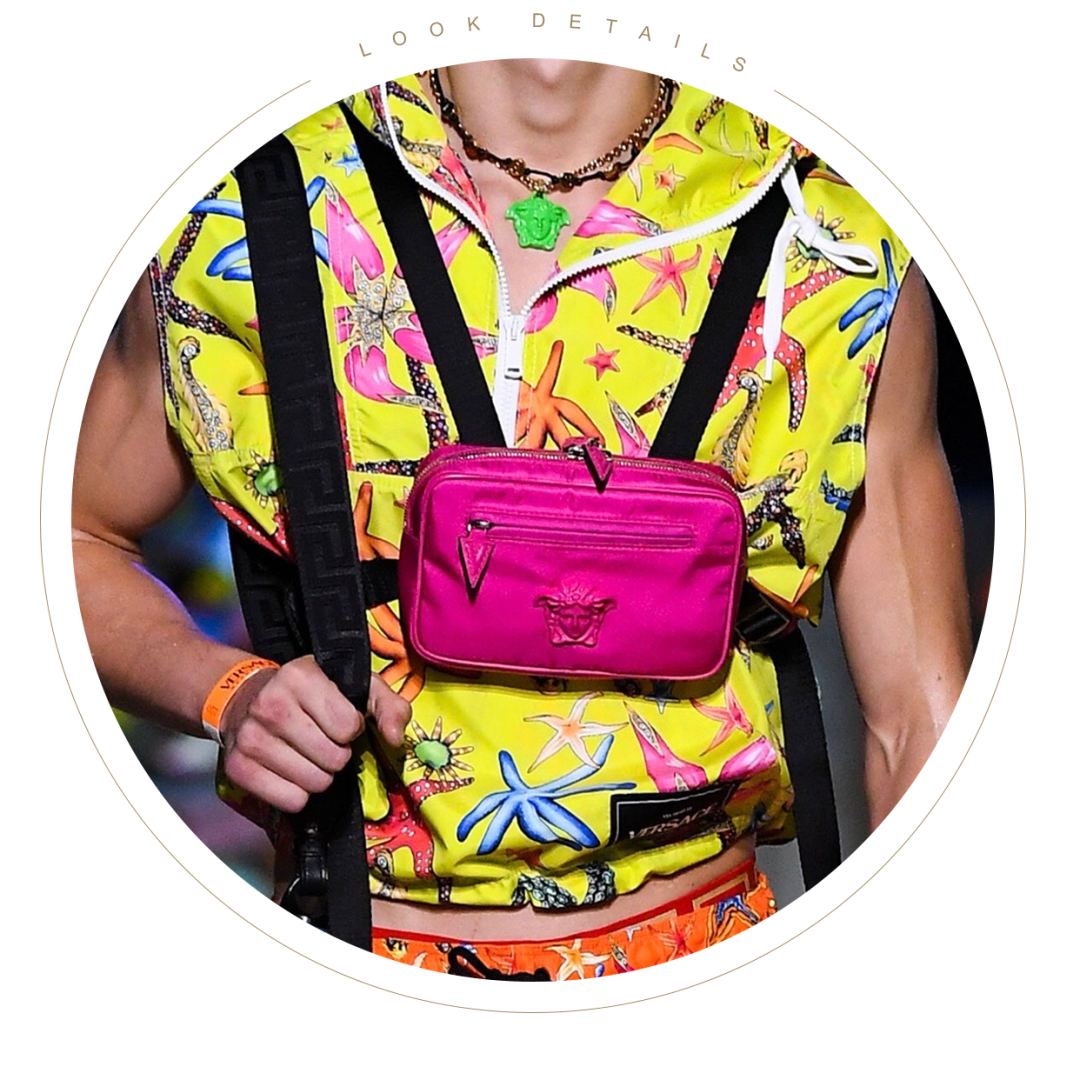 男装造型透露出轻松感:去掉衣领,衬衫敞开,信心满满、惬意自在。有机棉制成的运动衫和针织网眼面料是本系列可持续性的基础。多种沙滩装款式均采用有机纤维和可回收聚酯纤维及聚氨酯材料制成。致力于成为一个更环保的品牌是Versace一直追求的目标之一。